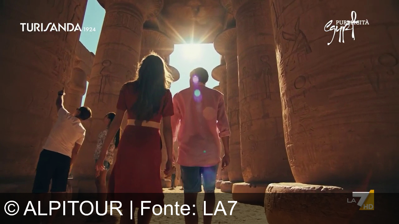 Tre persone camminano tra colonne di un antico tempio egizio. Le colonne sono incise con geroglifici. A sinistra in alto c'è il logo "TURISANDA 1924" e a destra "PUBBLICITÀ". Due persone guardano avanti, una guarda in alto. La scena è illuminata dal sole. In basso a destra è visibile il logo "LA7 HD".