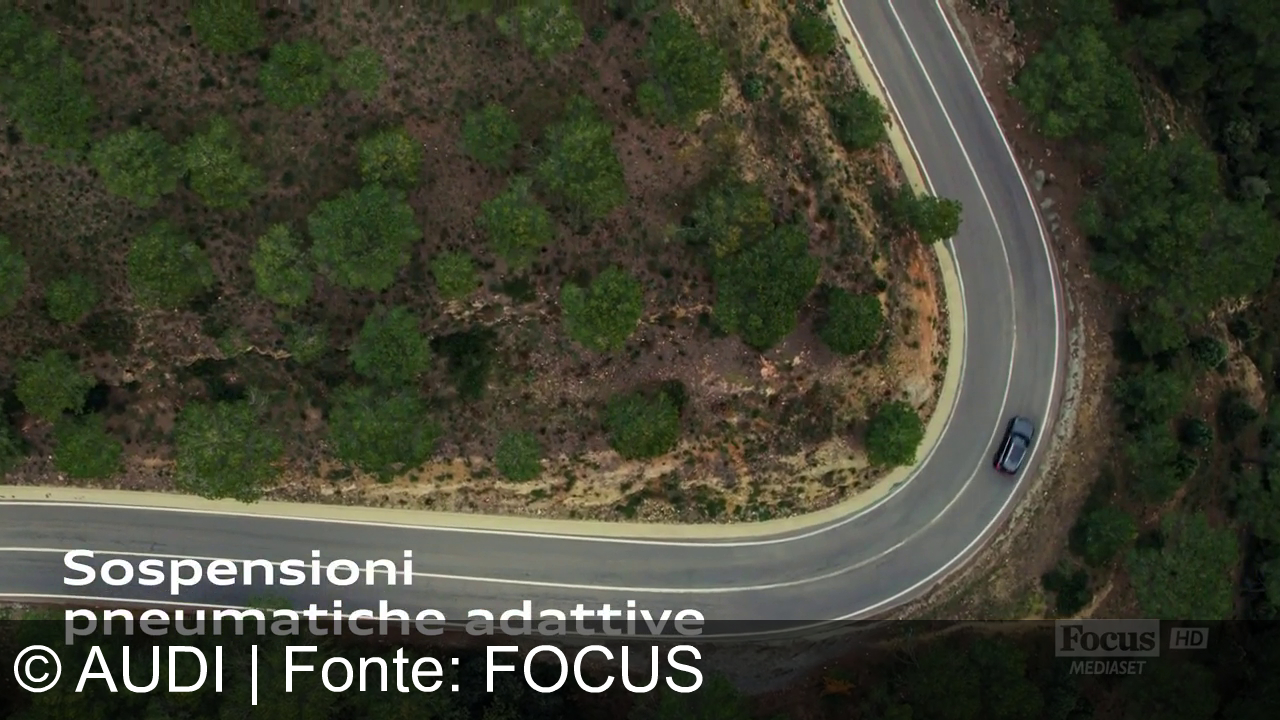 Vista dall'alto di una strada tortuosa immersa nel verde. Un'auto percorre una curva. In basso a sinistra si leggono le parole "Sospensioni pneumatiche adattive". Nell'angolo in basso a destra appare il logo "Focus HD Mediaset".