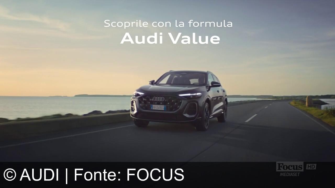 Un'auto Audi nera corre su una strada lungo la costa. Il sole tramonta all'orizzonte riflettendosi sull'acqua. Testo in sovrimpressione dice "Scoprile con la formula Audi Value Leasing". In basso a destra, il logo di Focus HD Mediaset.