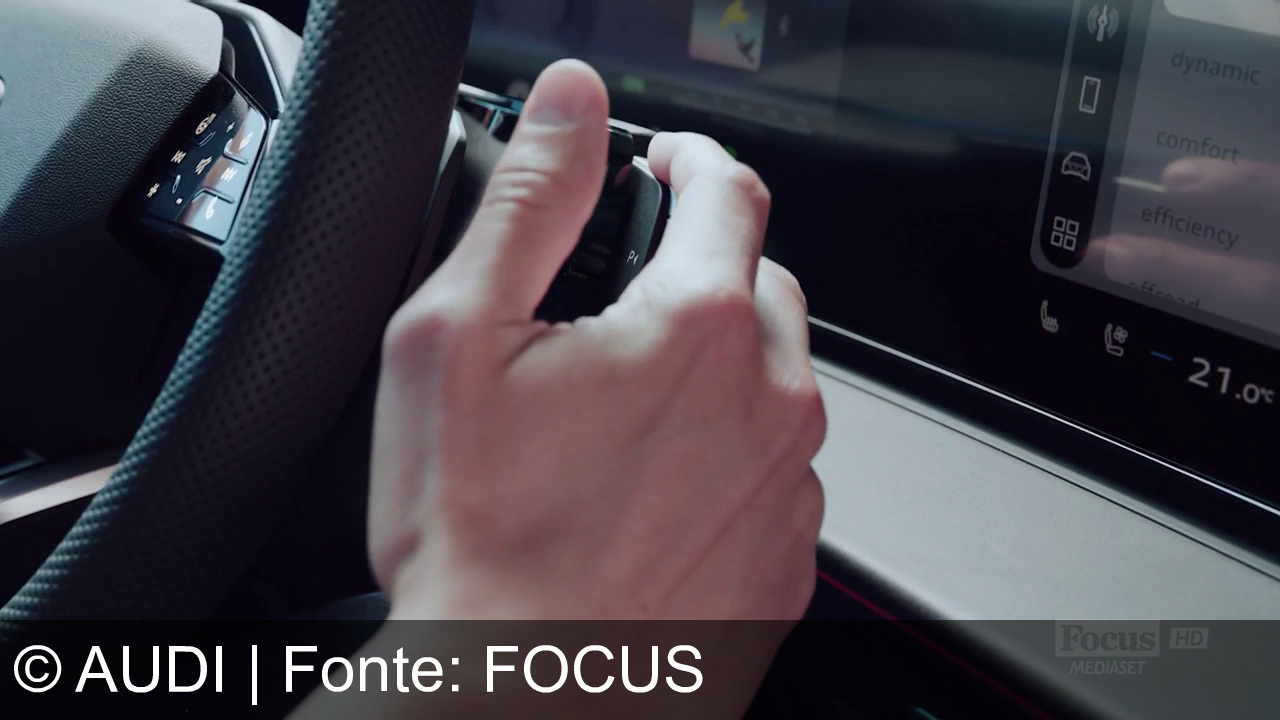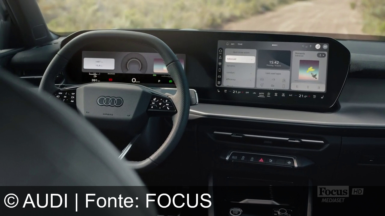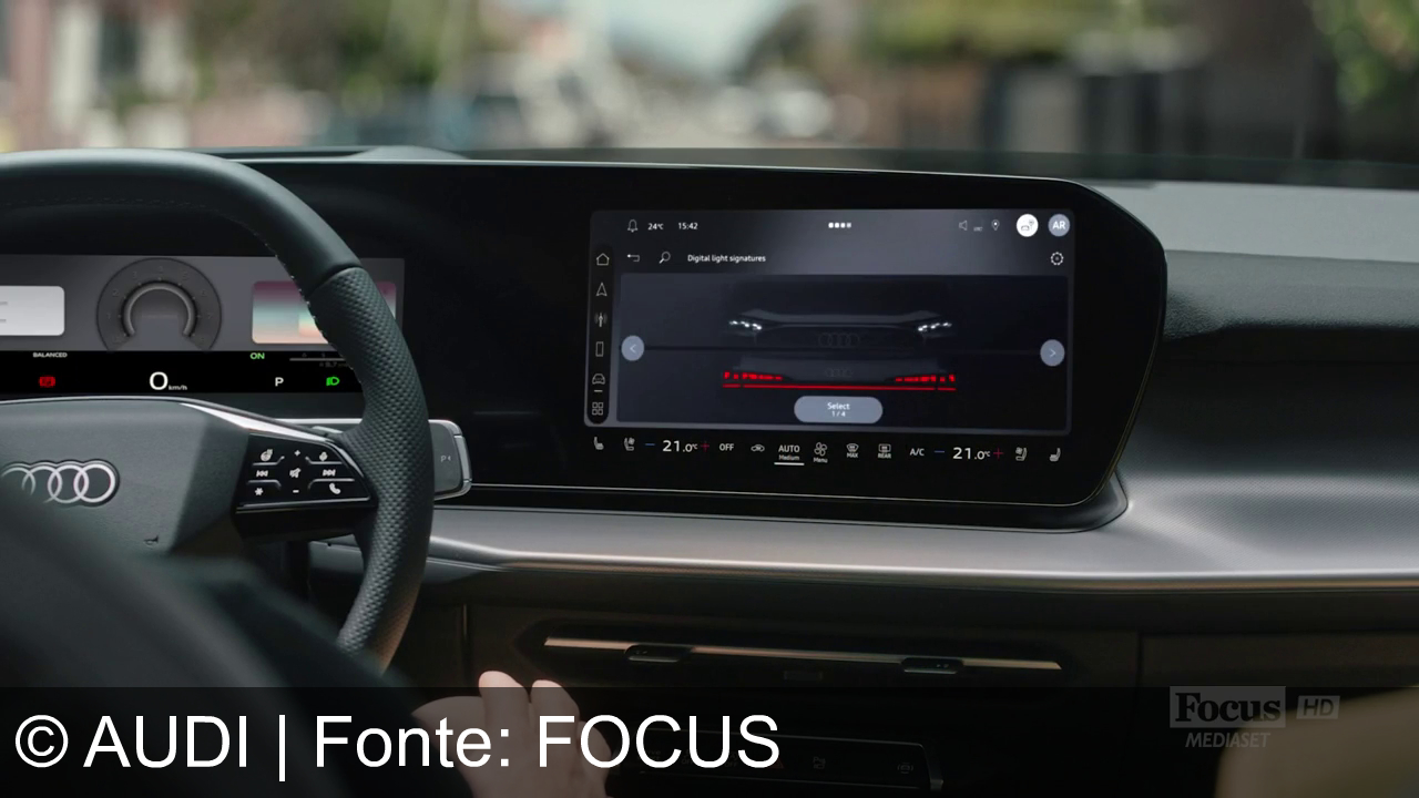 Interno di un'auto con un volante marchiato Audi. Cruscotto digitale con indicatori di guida e display centrale touch che mostra il controllo della climatizzazione e un'app musicale. Riflessi luminosi sul display e sfondo esterno leggermente visibile attraverso il parabrezza. Logo "Focus HD Mediaset" in basso a destra.