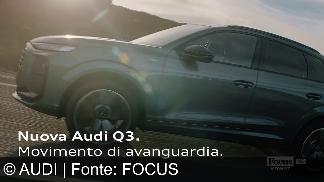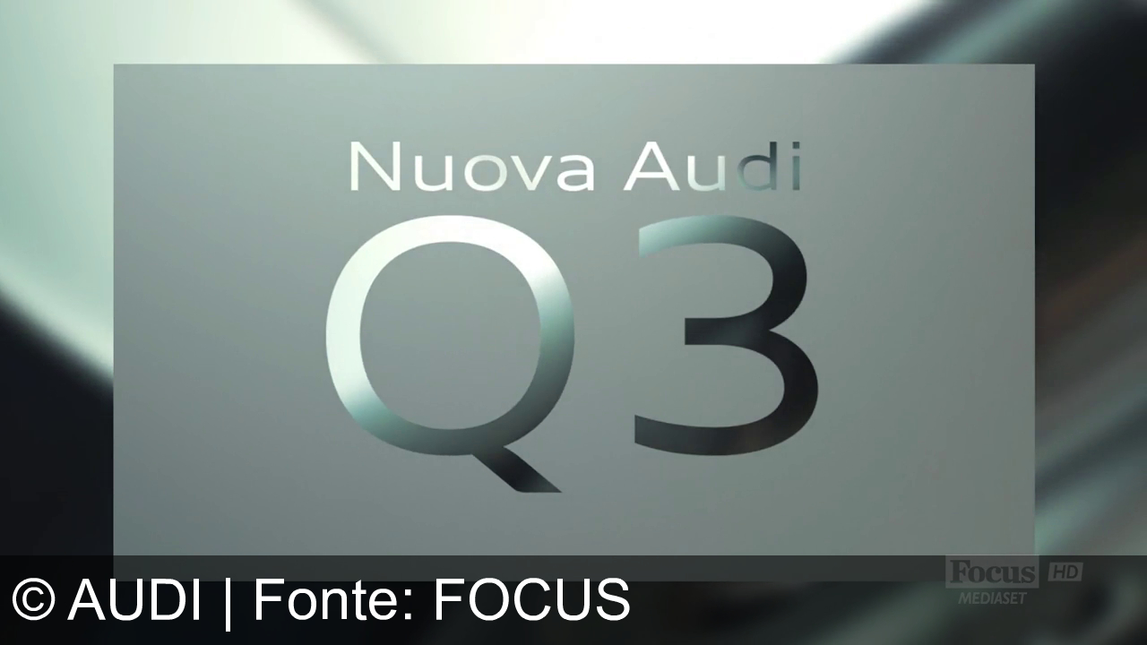 Un cartello grigio con la scritta "Nuova Audi Q3". In basso a destra, logo "Focus Mediaset HD".