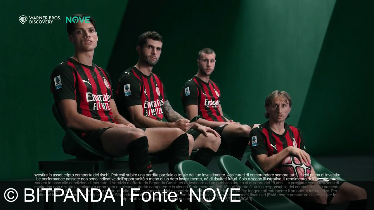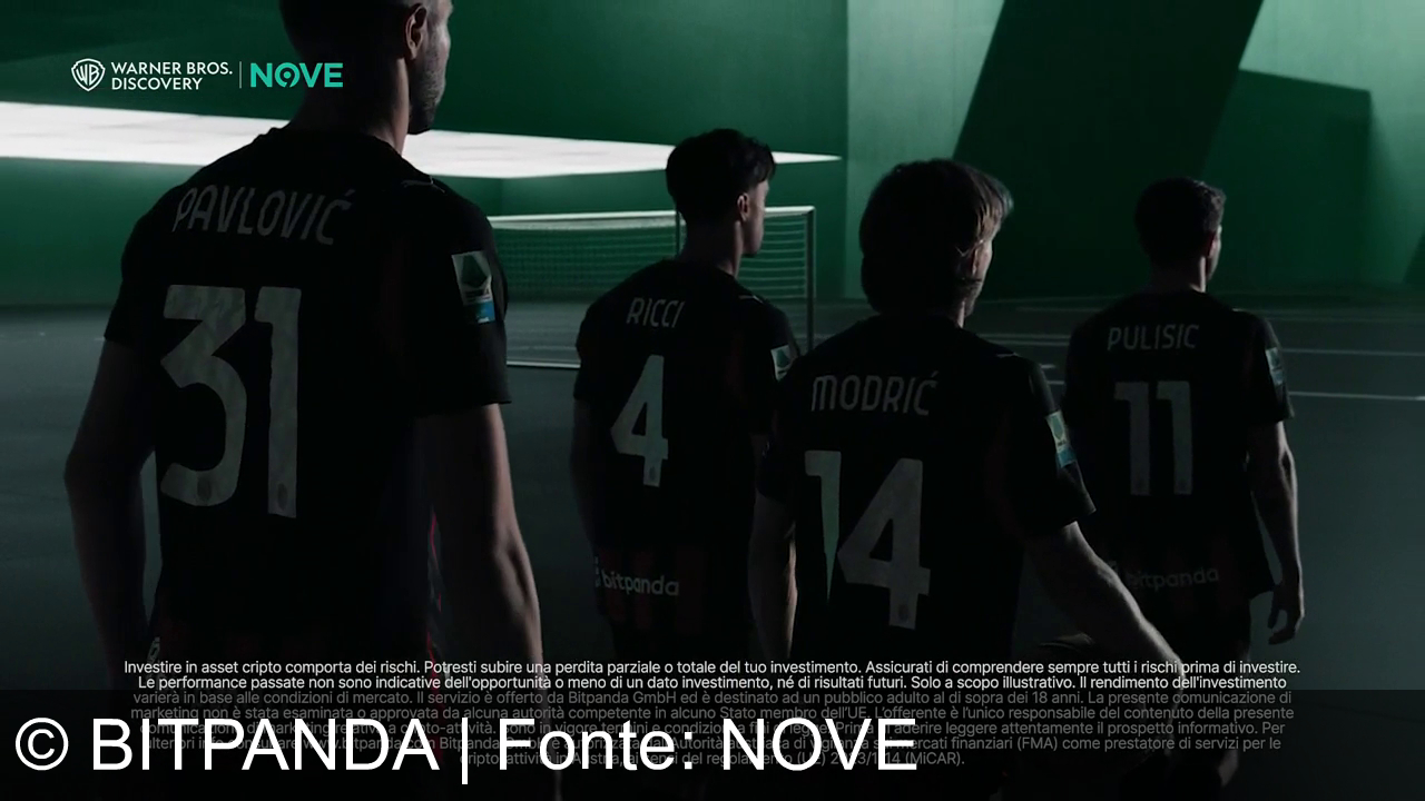Su uno sfondo verde scuro, il testo bianco dice "Se cripto, allora Bitpanda." Ci sono i loghi di Bitpanda e AC Milan, con la scritta "Crypto Partner Ufficiale". In alto a sinistra ci sono i loghi di Warner Bros. Discovery e Nove. C’è anche del testo in piccolo riferito ai rischi dell’investimento in criptovalute.