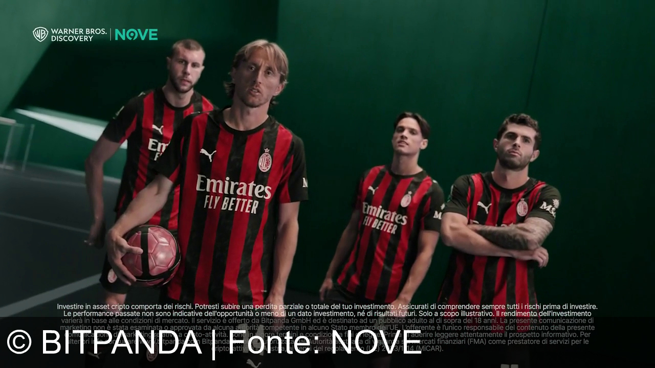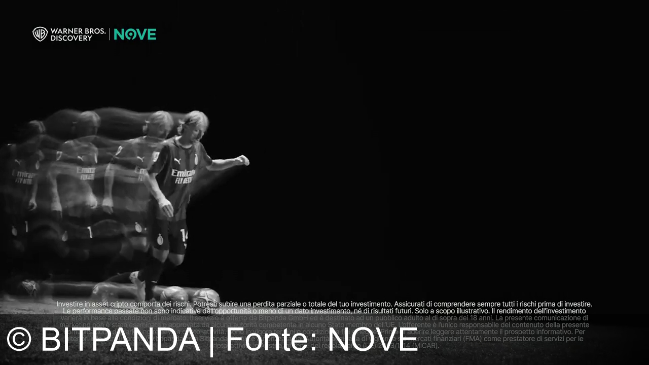 Un uomo con capelli chiari indossa una maglia rossonera con sponsor crittografico. Sullo sfondo, un'altra persona con la stessa maglia. In alto a sinistra, loghi di Warner Bros. Discovery e Nove. In basso ci sono delle scritte informative sulla criptovaluta e i suoi rischi. Lo sfondo è verde scuro.