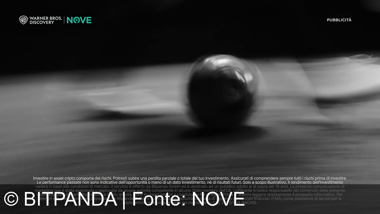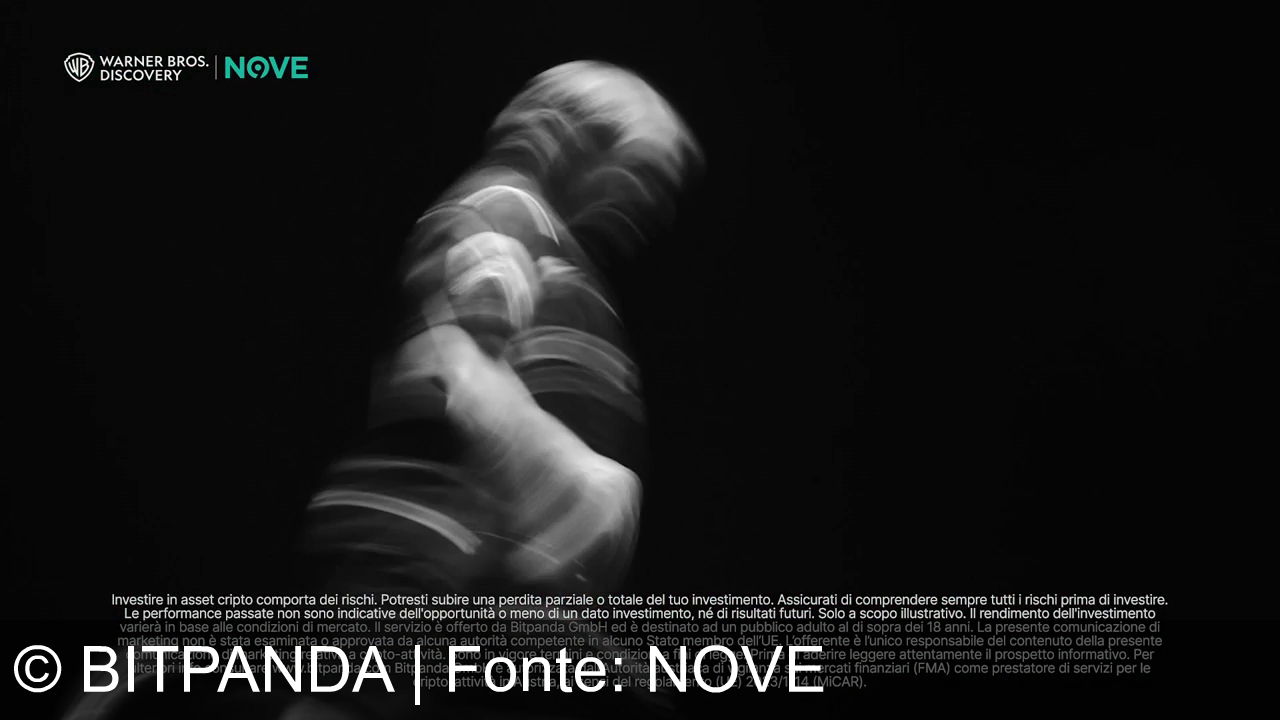 Una figura sfocata in bianco e nero con movimento su sfondo nero. In alto a sinistra ci sono i loghi di Warner Bros. Discovery e NOVE. Sotto, un testo descrive avvertenze sui rischi legati agli investimenti in asset crypto e menziona la piattaforma Bitpanda.