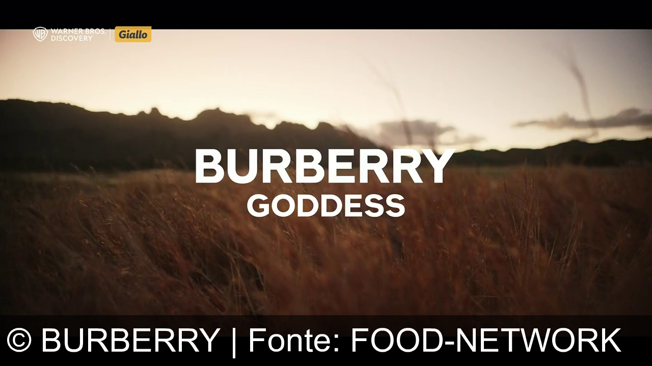 Campo di erba alta al tramonto, con montagne sullo sfondo. Testo centrale "BURBERRY GODDESS" in bianco. Logo Warner Bros. Discovery e Giallo in alto.