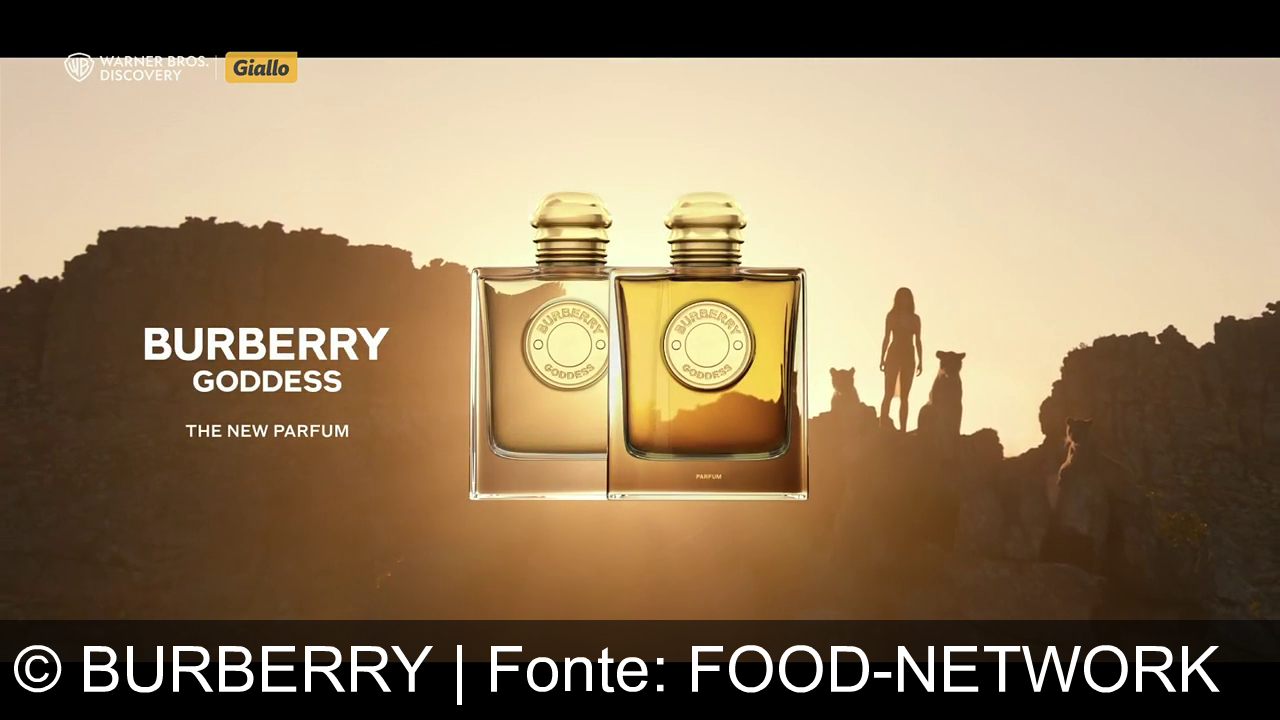 Due flaconi di profumo Burberry Goddess a lato dello schermo. Sullo sfondo, sagoma di una persona e tre felini su una roccia con il tramonto. Testi sullo schermo: "BURBERRY GODDESS" e "THE NEW PARFUM". Logo Warner Bros. Discovery e Giallo in alto.