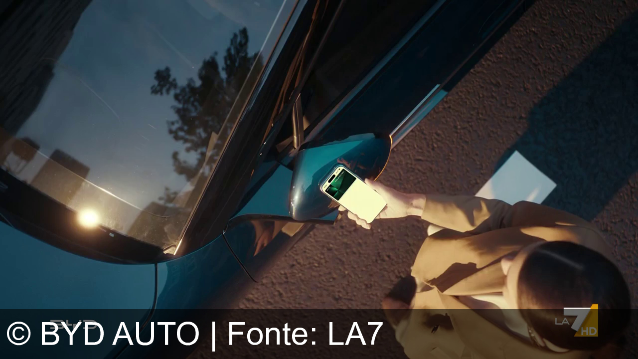 Una persona con un cappotto marrone tiene uno smartphone vicino allo specchietto laterale di un'auto blu. Sullo schermo del telefono c'è l'immagine di una chiave. L'auto riflette il cielo e gli alberi. Nella parte inferiore sinistra c'è il logo "BYD" e nella parte inferiore destra, il logo "LA 7 HD".