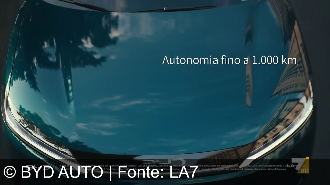 Il cofano di un'auto è riflesso nel cielo e in alcuni edifici. Sopra c'è il testo "Autonomia fino a 1.000 km". In basso a sinistra si nota il logo BYD e in basso a destra c'è un piccolo logo di La7 con la dicitura "HD".