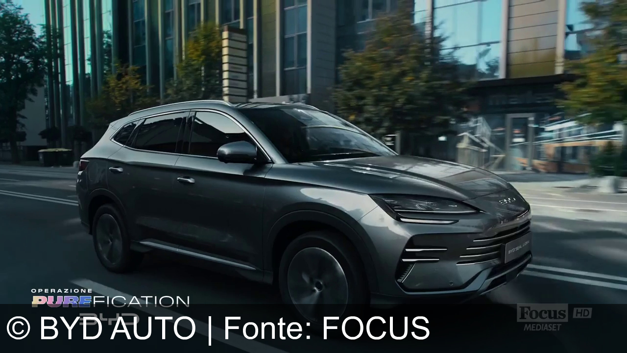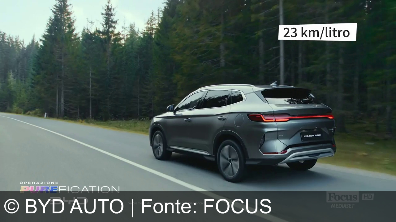 Un SUV grigio percorre una strada asfaltata in mezzo a una foresta di conifere. In alto a destra è scritto "23 km/litro" e in basso a sinistra "Operazione Purification BYD". C'è anche il logo di Focus Mediaset HD.
