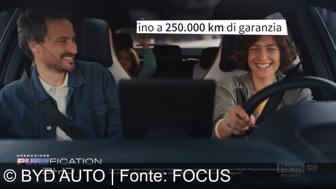 Una donna guida un'auto mentre sorride, seduta accanto a un uomo che sorride anche lui. Un bambino è seduto sul sedile posteriore, con le braccia alzate. Sopra, c'è un testo che dice "fino a 250.000 km di garanzia". In basso a sinistra, c’è il logo "Operazione Purification BYD" e altre informazioni su garanzia e condizioni.