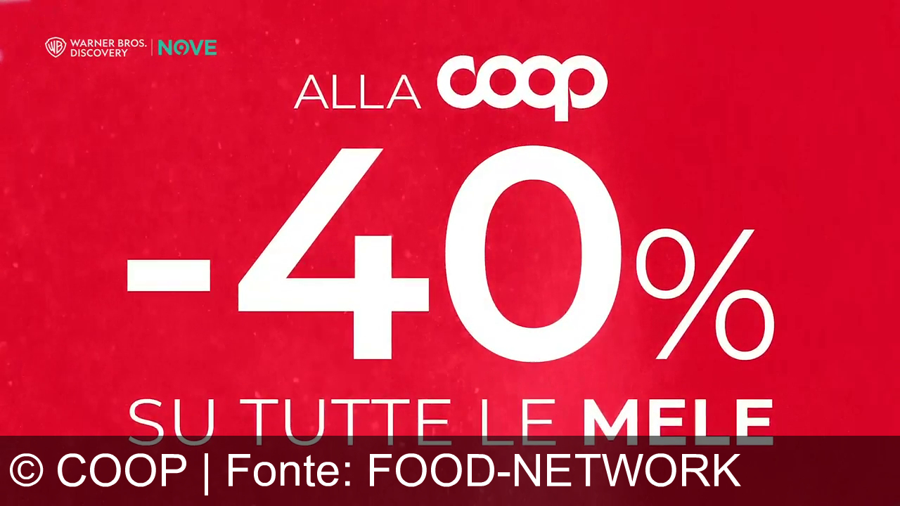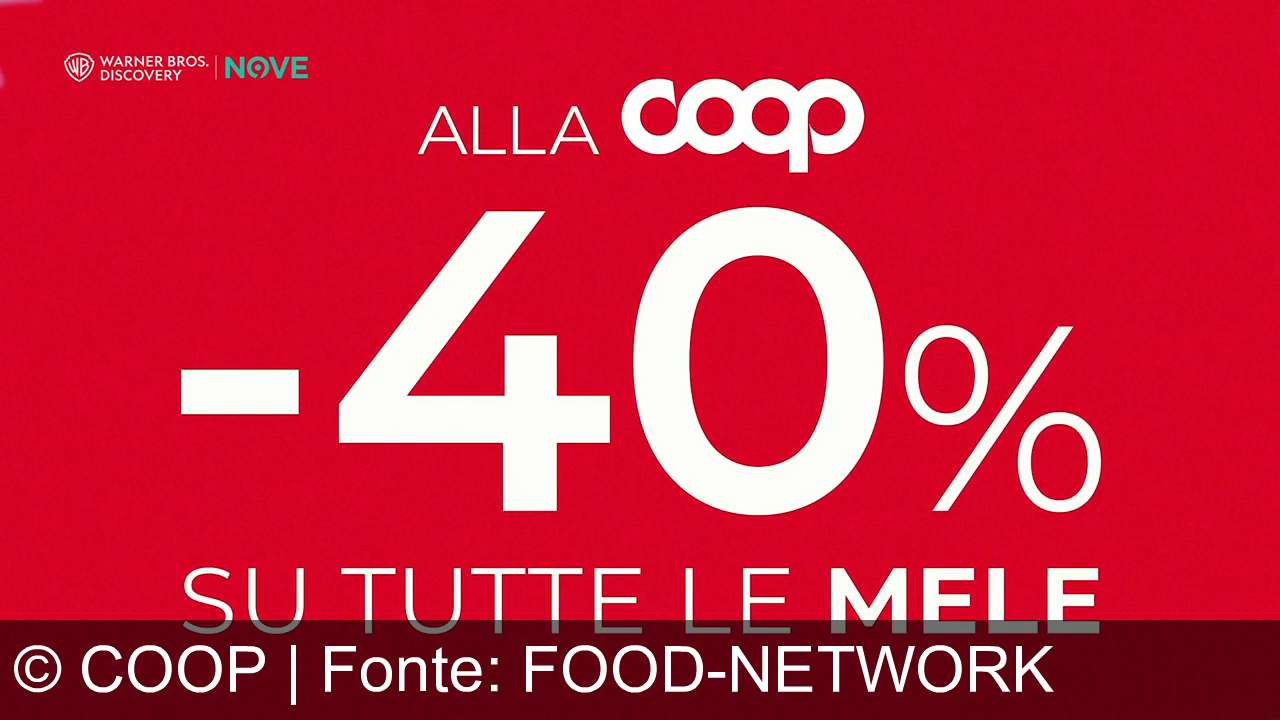 Sfondo rosso con scritte in bianco. C'è un'offerta del 40% di sconto su tutte le mele alla Coop. In alto a sinistra appaiono i loghi di Warner Bros. Discovery e Nove.