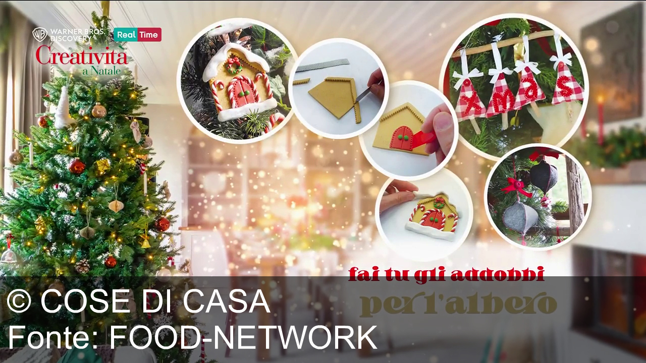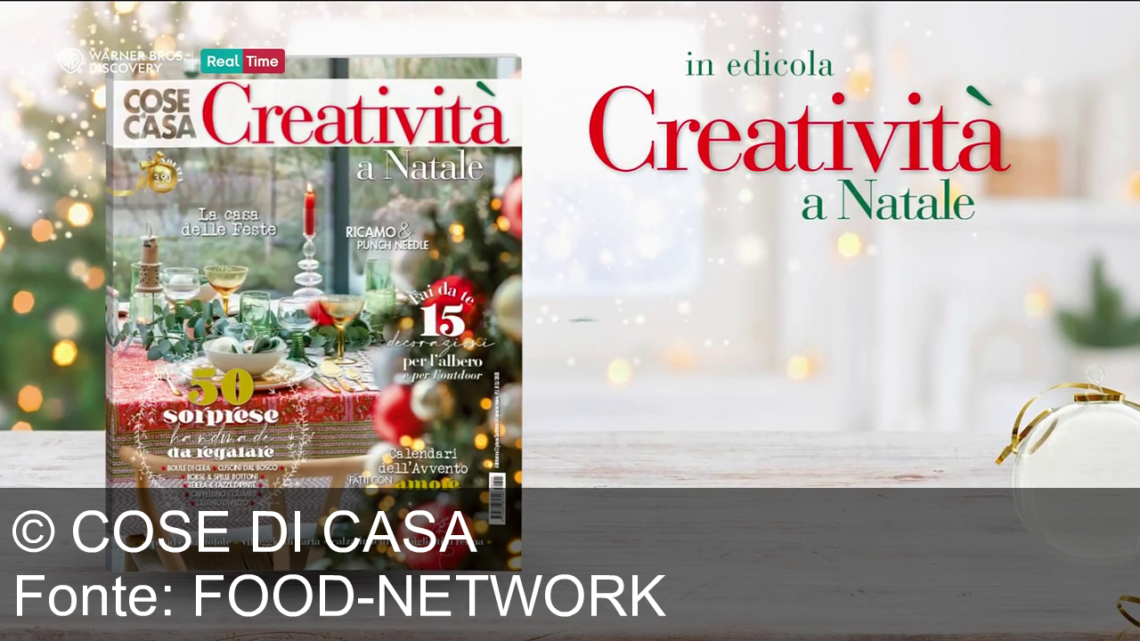 Una rivista di Natale "Creatività a Natale" con immagini di decorazioni e una tavola festiva. Testo include "50 sorprese", "La casa delle feste", "15 decorazioni fai da te". Disegni di renna, albero e calza decorano la scena. Un cerchio con il logo di "Real Time" e "Warner Bros Discovery" in alto a sinistra. In basso, scritte sulle attività creative natalizie.