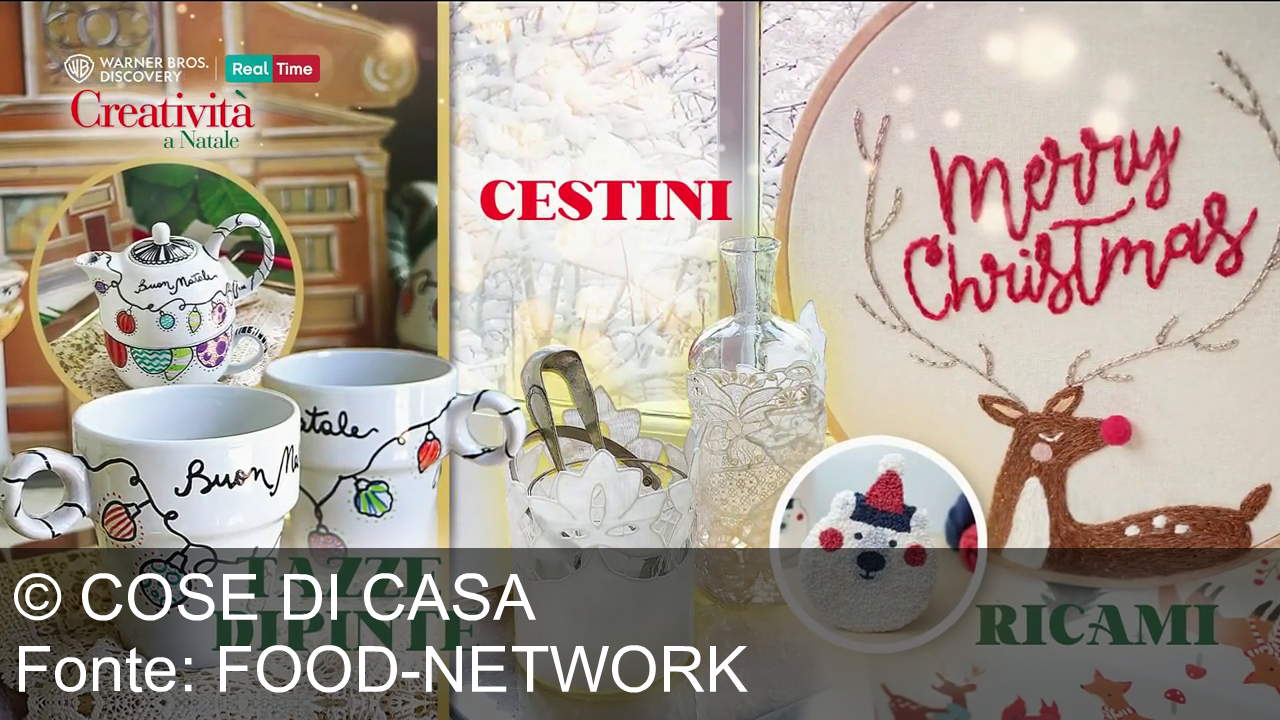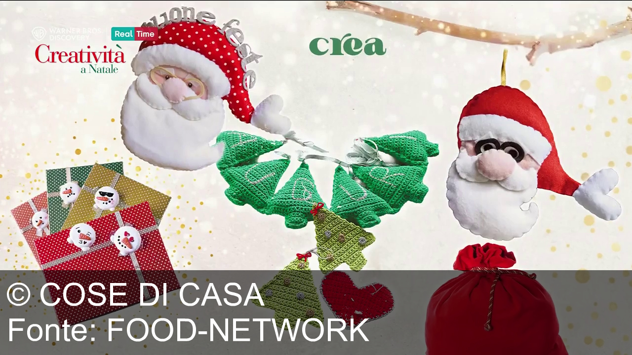 Babbo Natale con cappello a pois, decorazioni natalizie all’uncinetto, un cuore rosso, alberelli verdi e pacchi regalo. Scritte: "Creatività a Natale" e "Buone feste". Logo "Real Time" e "Warner Bros. Discovery". Sfondo con punti dorati.