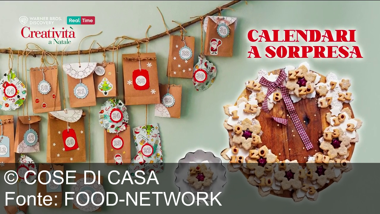 Un ramo con sacchetti numerati per calendario dell'Avvento, ognuno con decorazioni festive. A destra, una corona di biscotti con numeri e una stella centrale viola, legata con un nastro a quadretti. In alto, scritta "CALENDARI A SORPRESA" in rosso. Logo Warner Bros. Discovery e Real Time sopra a sinistra.