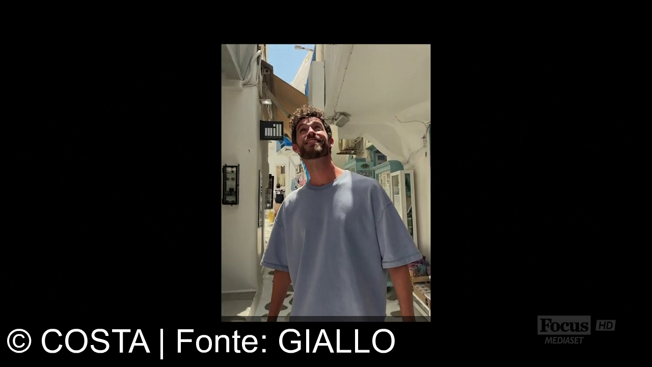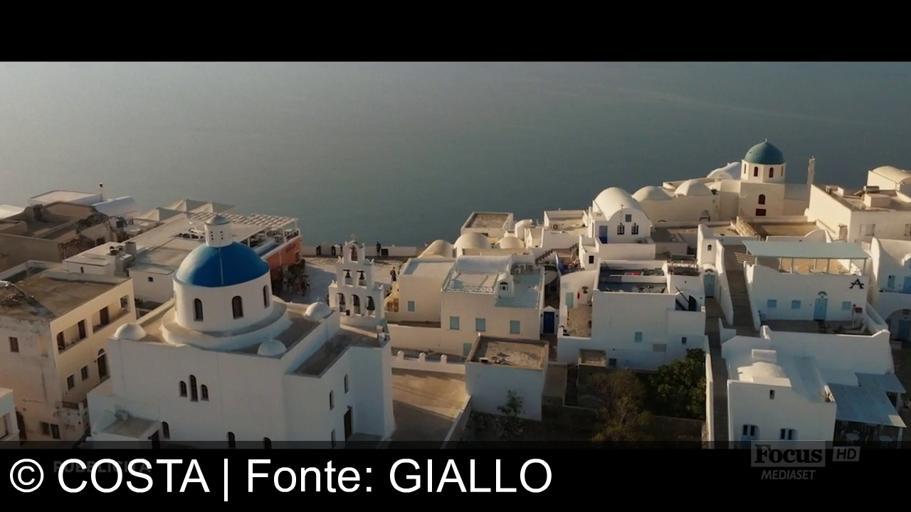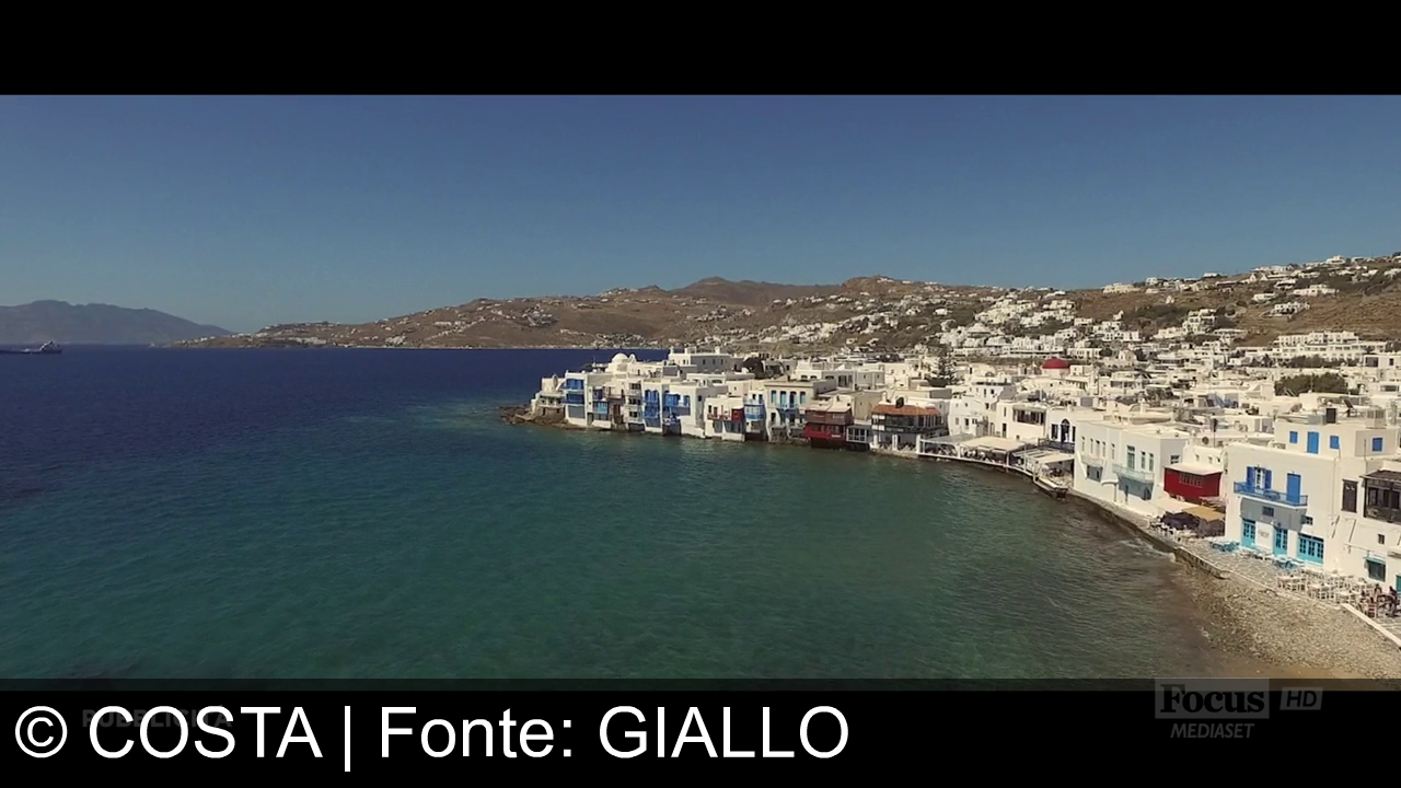 Una costa con case bianche e dettagli blu si affaccia su un mare limpido. Le colline brulle si stagliano sullo sfondo. Un traghetto si intravede all'orizzonte. In basso a destra, i loghi "Focus" e "Mediaset" con la scritta "Pubblicità" in basso a sinistra.