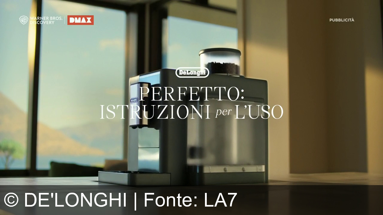 Una macchina da caffè DeLonghi su un tavolo, con sfondo di una finestra aperta sul paesaggio. Sullo schermo si legge “Perfetto: istruzioni per l’uso”. In alto a sinistra un logo Warner Bros. Discovery e DMAX. In alto a destra la scritta "Pubblicità".