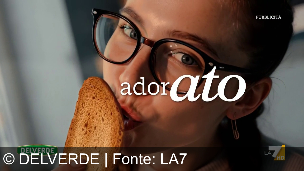 Una ragazza con occhiali grandi tiene una fetta di pane tostato vicino alla bocca e guarda dritto in camera. Sullo schermo compare la scritta adorato e in basso si vede il logo Delverde.