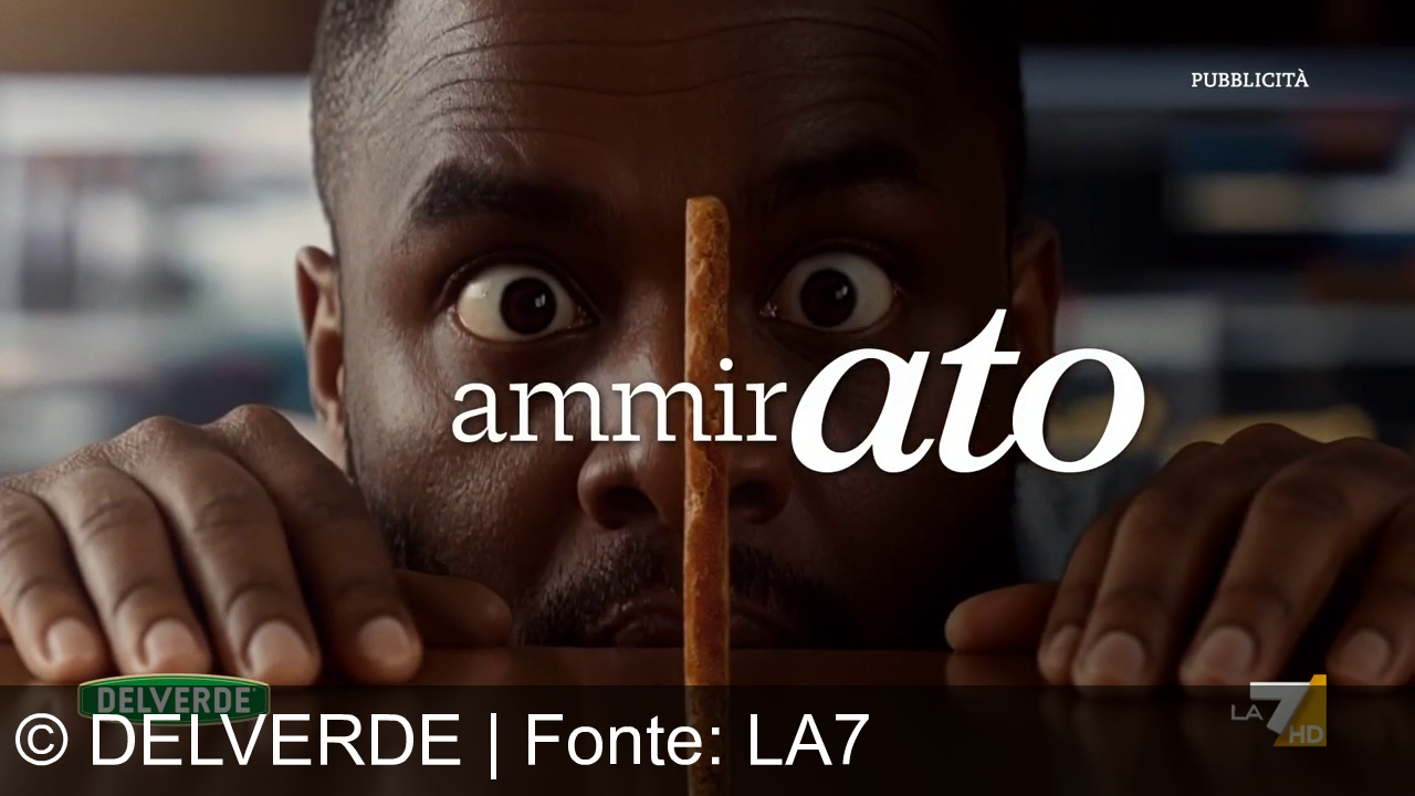 Un uomo con gli occhi spalancati fissa un grissino appoggiato sul tavolo, con le mani sul bordo. In mezzo spunta la scritta ammirato e in basso a sinistra il logo Delverde.