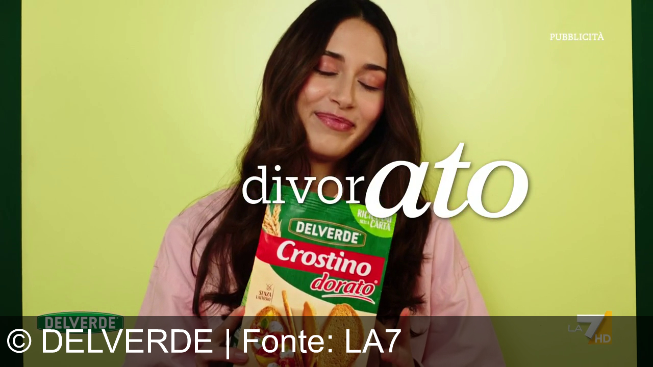 Una ragazza con una camicia rosa tiene tra le mani una scatola di Crostino Dorato Delverde e sorride a occhi chiusi davanti a uno sfondo verde chiaro. Sullo schermo compare la scritta divorato.