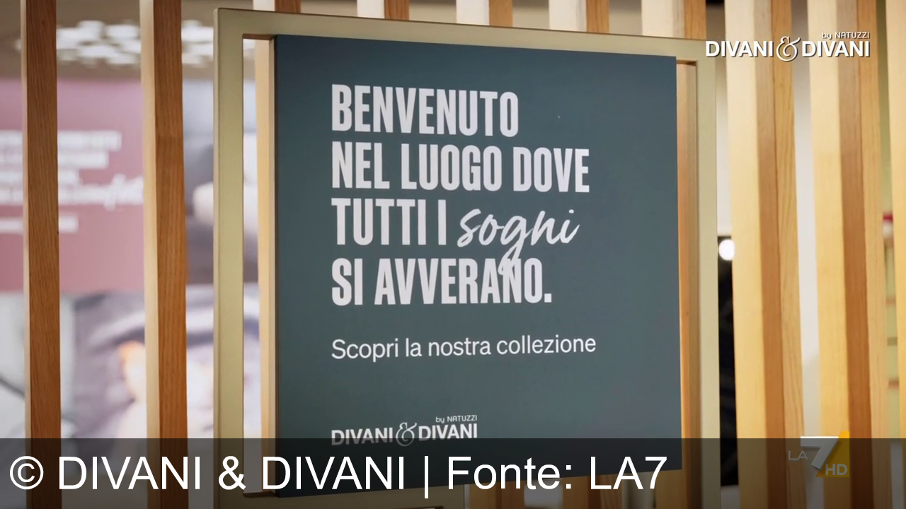 Un cartello con sfondo verde scuro e cornice dorata. Testo bianco: "BENVENUTO NEL LUOGO DOVE TUTTI I sogni SI AVVERANO. Scopri la nostra collezione". In alto a destra, logo "DIVANI & DIVANI by Natuzzi". In basso a destra, logo "LA 7 HD". Sfondo con elementi in legno e un pannello sfocato.