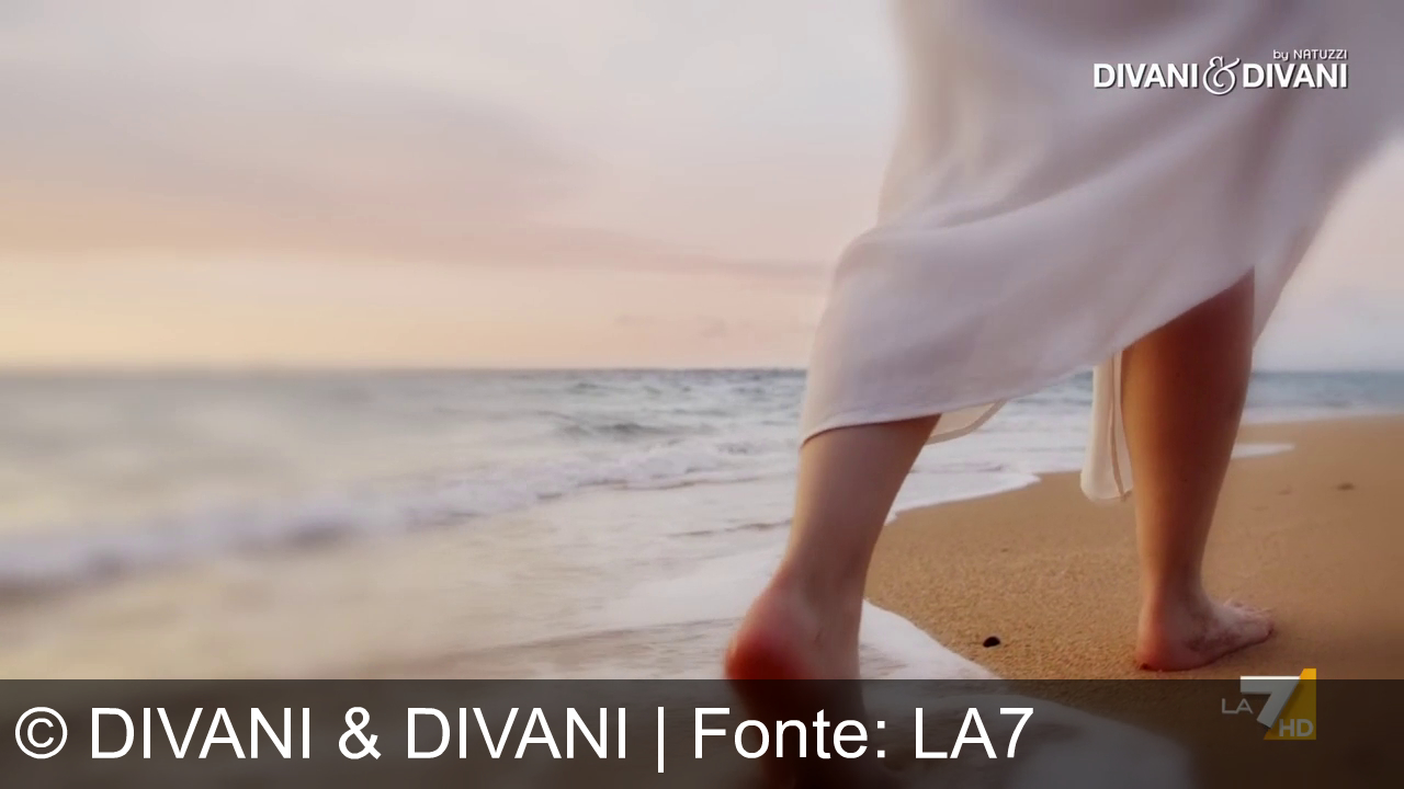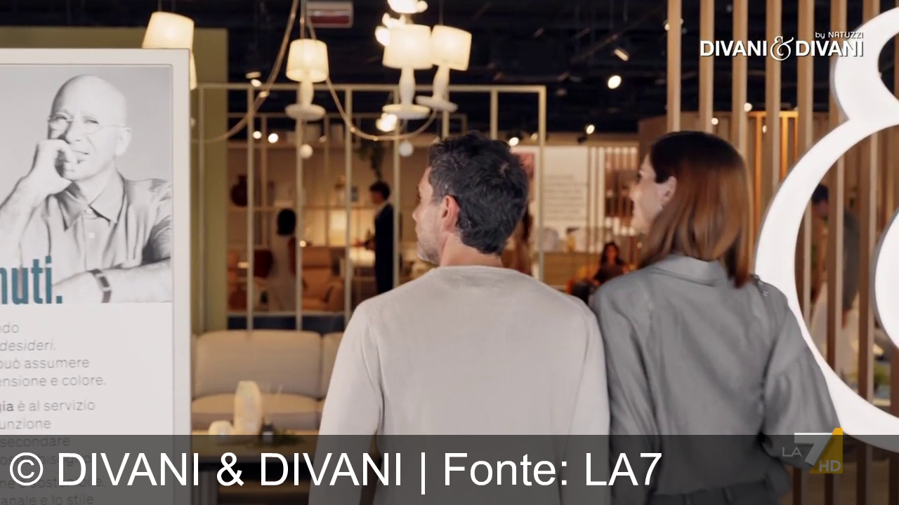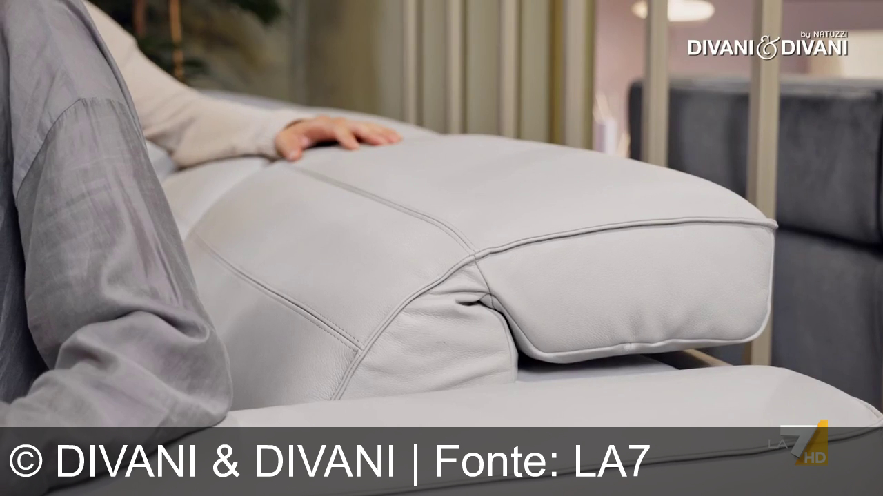 Una mano appoggiata su un divano in pelle chiara. Un braccio, con manica grigia, vicino al cuscino. Sfondo con elementi d'arredo e logo “Divani & Divani” in alto a destra. Logo “LA7 HD” in basso a destra.