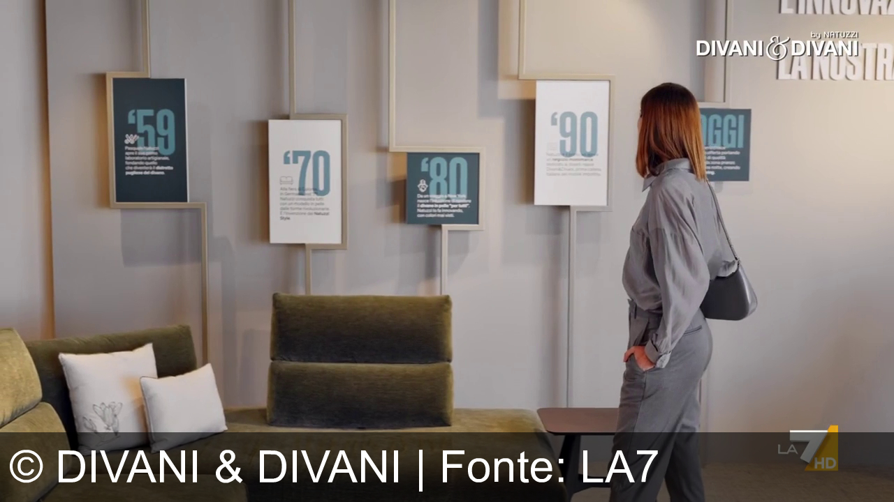 Una donna in tuta grigia osserva le pareti con cornici che indicano decenni diversi: '59, '70, '80, '90. Sul lato sinistro ci sono un divano verde e un paio di cuscini chiari. Nell'angolo in alto a destra compare il marchio "DIVANI & DIVANI". In basso a destra è visibile il logo di "LA7 HD".