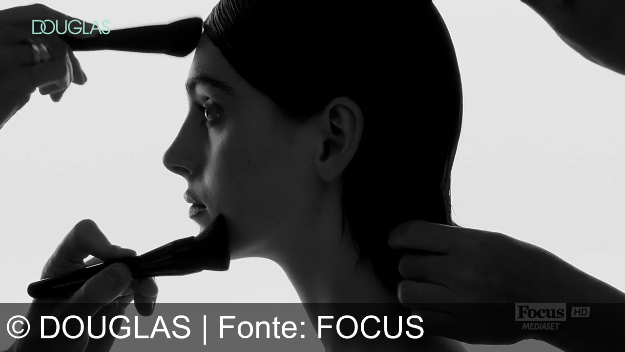 Una persona vista di profilo riceve un'applicazione di trucco con un pennello sul viso e viene sistemata nei capelli. Sfondo chiaro, contrasti in bianco e nero, logo "Douglas" in alto a sinistra, "Focus HD Mediaset" in basso a destra.