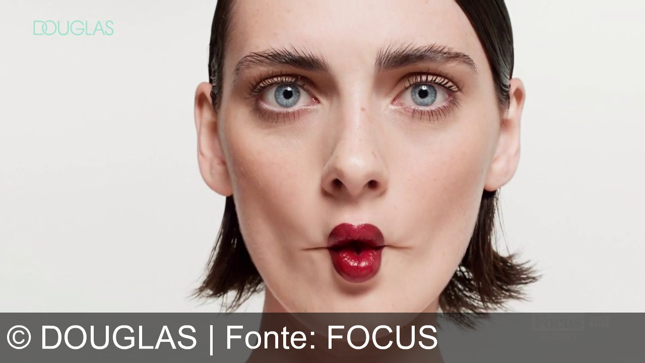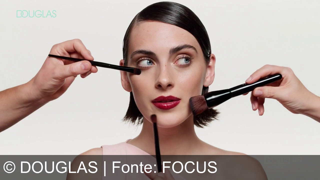 Una persona con rossetto rosso guarda di lato. Attorno al viso ci sono tre pennelli per il trucco, tenuti da mani diverse. Uno vicino all'occhio destro, uno sotto l'occhio sinistro e uno vicino alla mascella. Sfondo chiaro, logo "Douglas" in alto a sinistra e scritta "Focus Mediaset" in basso a destra.