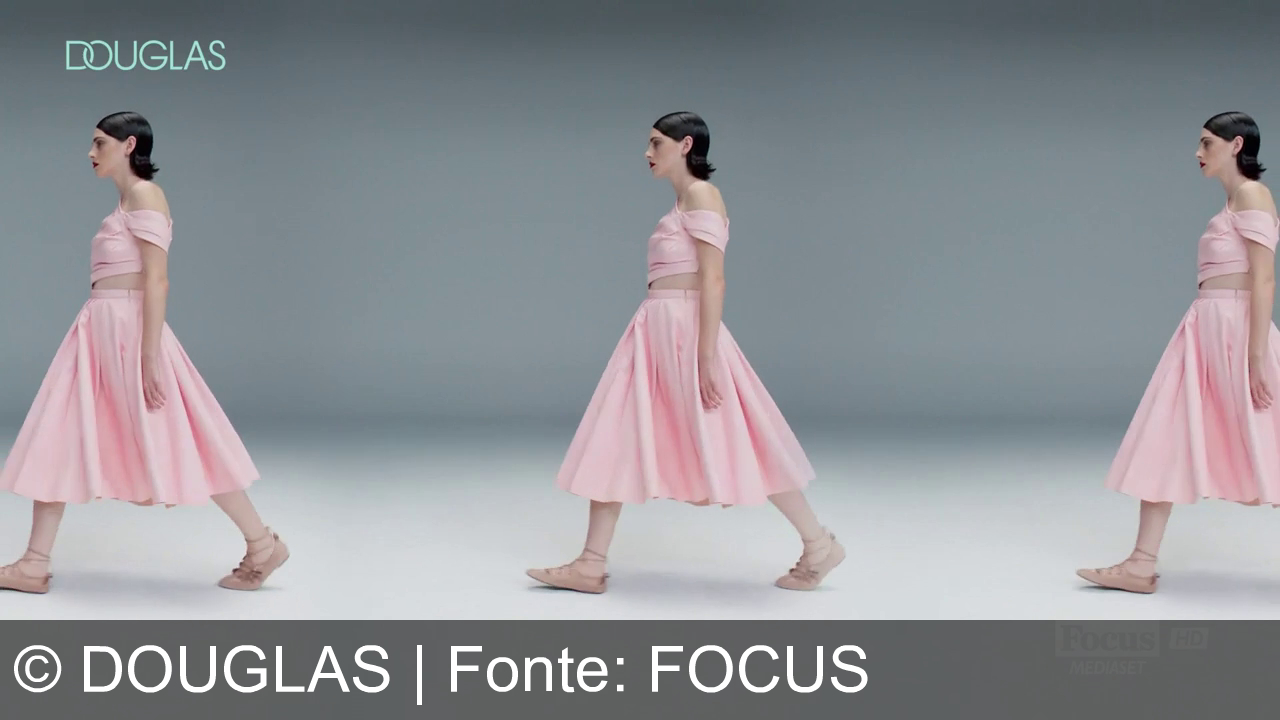 Una donna cammina su sfondo grigio. Indossa un vestito rosa chiaro con top e gonna lunga. Ha i capelli scuri raccolti e sandali chiari. Logo "DOUGLAS" in alto a sinistra, logo "Focus HD MEDIASET" in basso a destra.