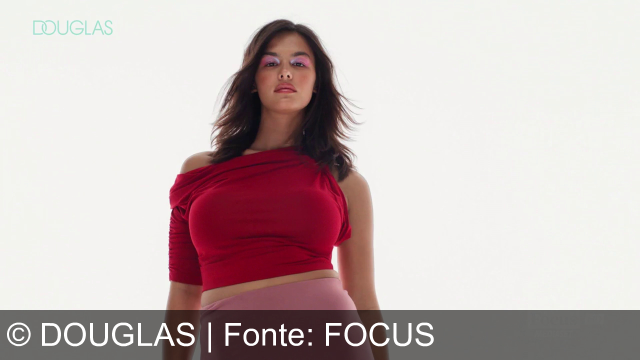 Una donna con capelli scuri indossa un top rosso e una gonna rosa. Sullo sfondo bianco c'è il logo "DOUGLAS" in alto a sinistra.