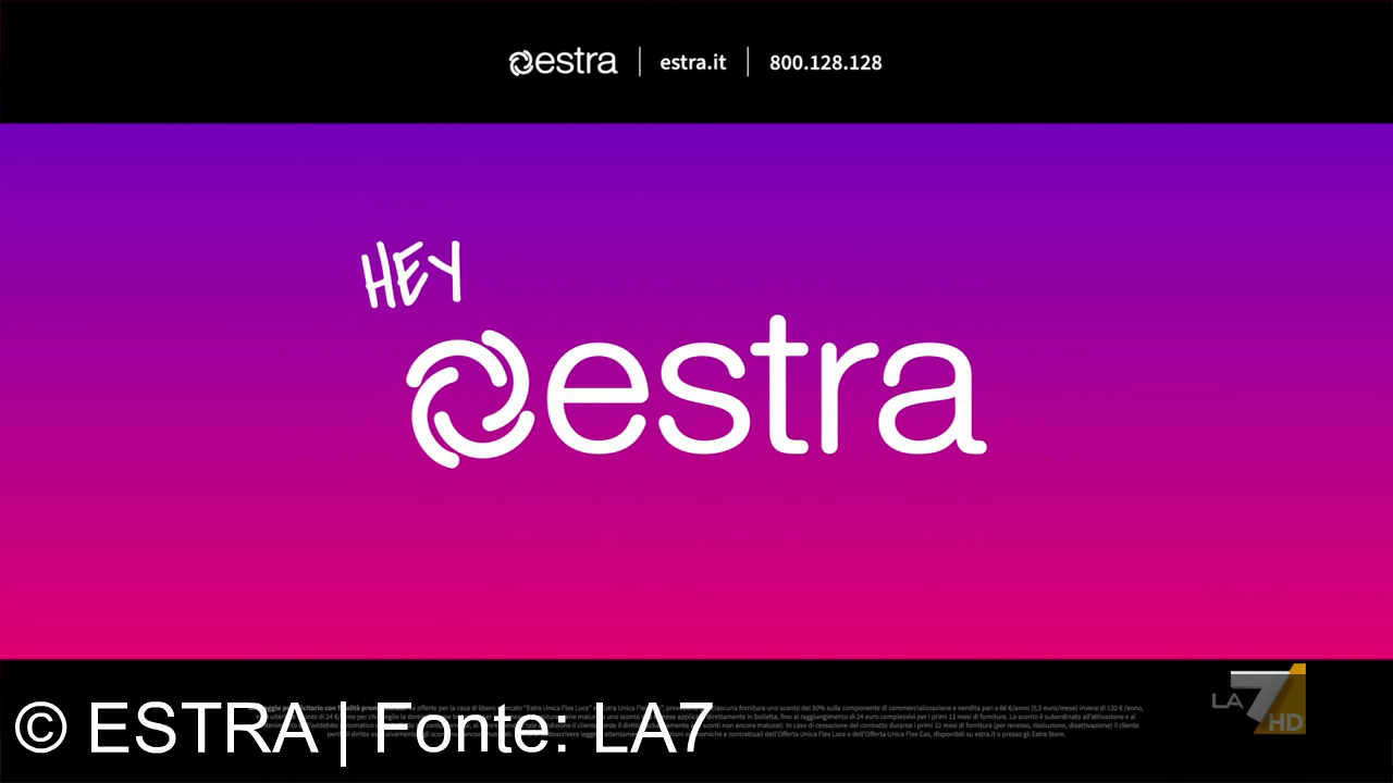 Sfondo sfumato viola-rosa con il testo "Hey estra" al centro. In alto, logo e contatti di Estra. In basso, disclaimer pubblicitario e logo di La7 HD.