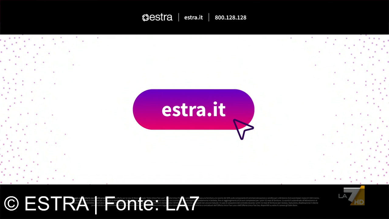 Un rettangolo arrotondato sfumato viola e rosa con la scritta "estra.it". Un cursore a freccia è accanto al testo. In alto ci sono logo, sito e numero di telefono di Estra. In basso, una nota legale. Sfondo bianco con puntini rosa sui lati. Nell'angolo in basso a destra, il logo di La7 HD.