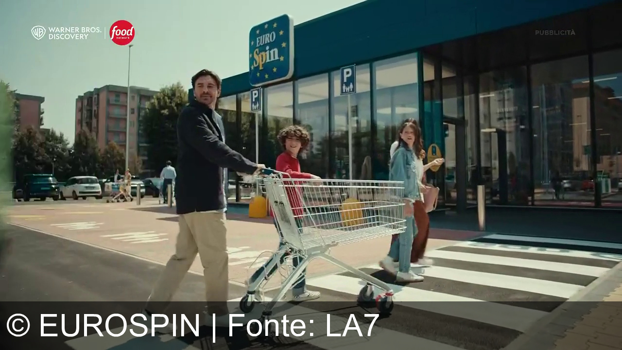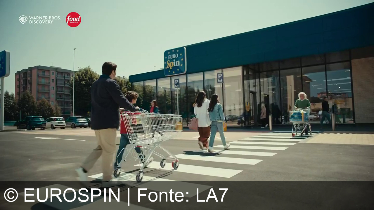 Un gruppo di persone attraversa le strisce pedonali con il carrello della spesa davanti a un supermercato Eurospin. A sinistra si vede un uomo con un bambino e a destra un signore con i capelli bianchi. In lontananza ci sono edifici e alcune auto parcheggiate. Sullo schermo ci sono i loghi di Warner Bros. Discovery e Food Network.