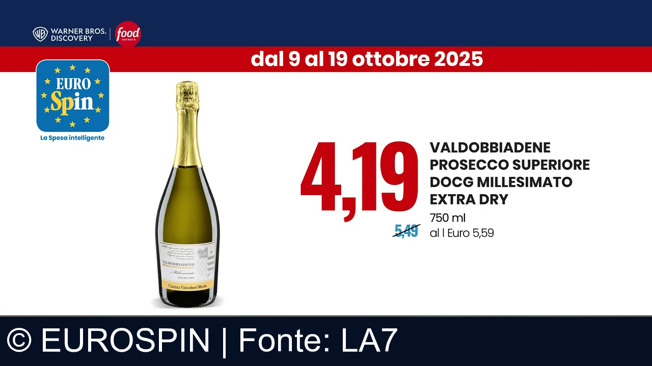 Pubblicità dell'anno 2025 di Eurospin, con il titolo da noi scelto: "Eurospin: Valdobbiadene Prosecco Superiore DOCG Millesimato 750 ml a soli 4,19 euro" con la breve descrizione: "Eurospin: la spesa intelligente è QI! Scopri Valdobbiadene Prosecco Superiore DOCG, freschezza e qualità unica a prezzi speciali. Eurospin, solo marche QI per te!". Questo annuncio riguarda o include la categoria Supermercato, Prosecco, Alimenti, Salame, Formaggio.