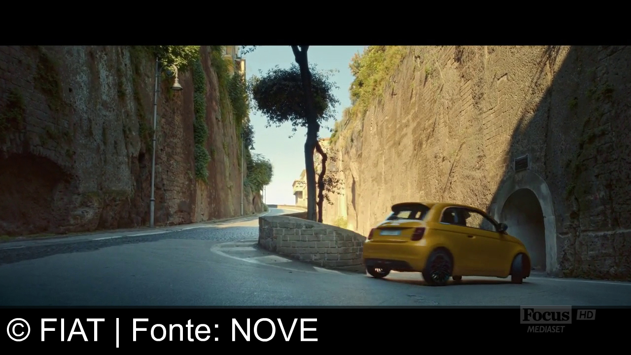Una Fiat 500 gialla percorre una strada di montagna affiancata da mura di pietra. In alto la scritta: "Nuova Fiat 500 Ibrida - Dall'Italia Con Amore". Sullo sfondo ci sono rocce e vegetazione. Nell'angolo in basso a destra, il logo "Focus HD Mediaset".