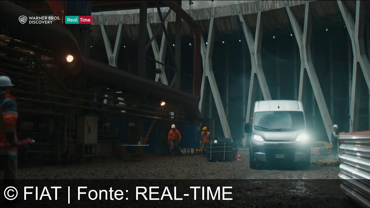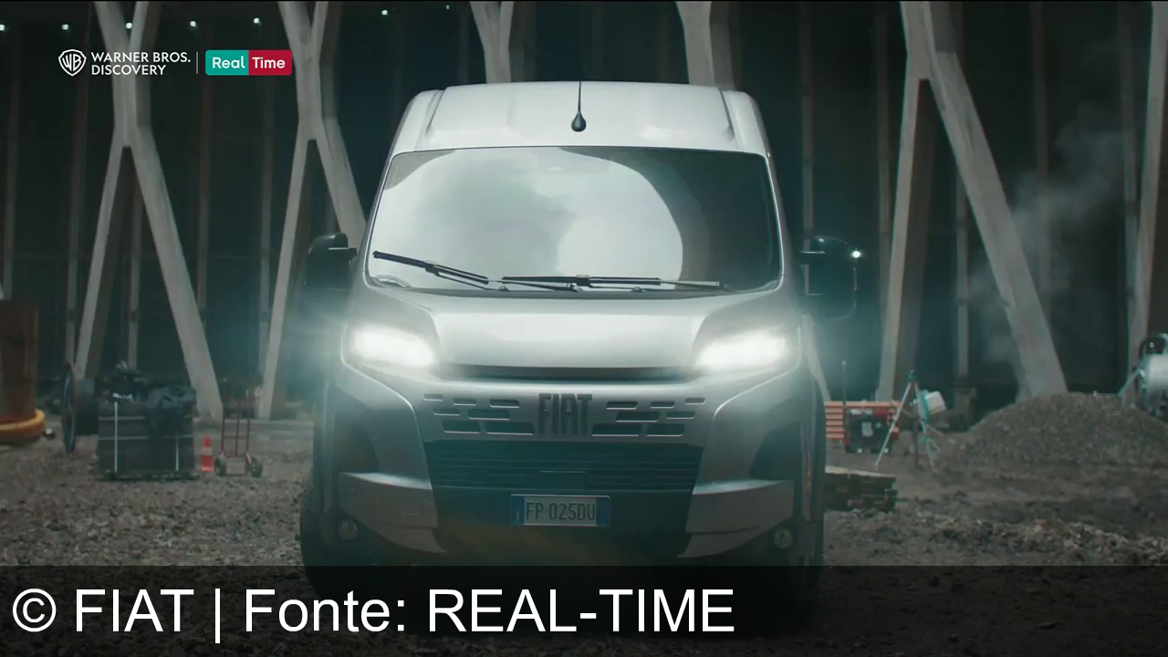 Un furgone Fiat attraversa un'area industriale con strutture metalliche e tubi arancioni. Un lavoratore con caschetto si vede sullo sfondo. Il testo sullo schermo dice “INARRESTABILE IN MODALITÀ POWER”. In alto a sinistra, i loghi di Warner Bros. Discovery e Real Time.