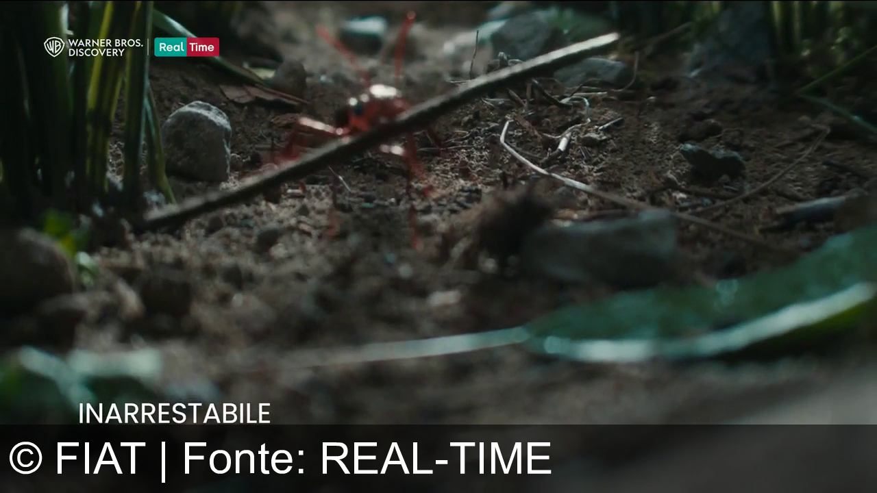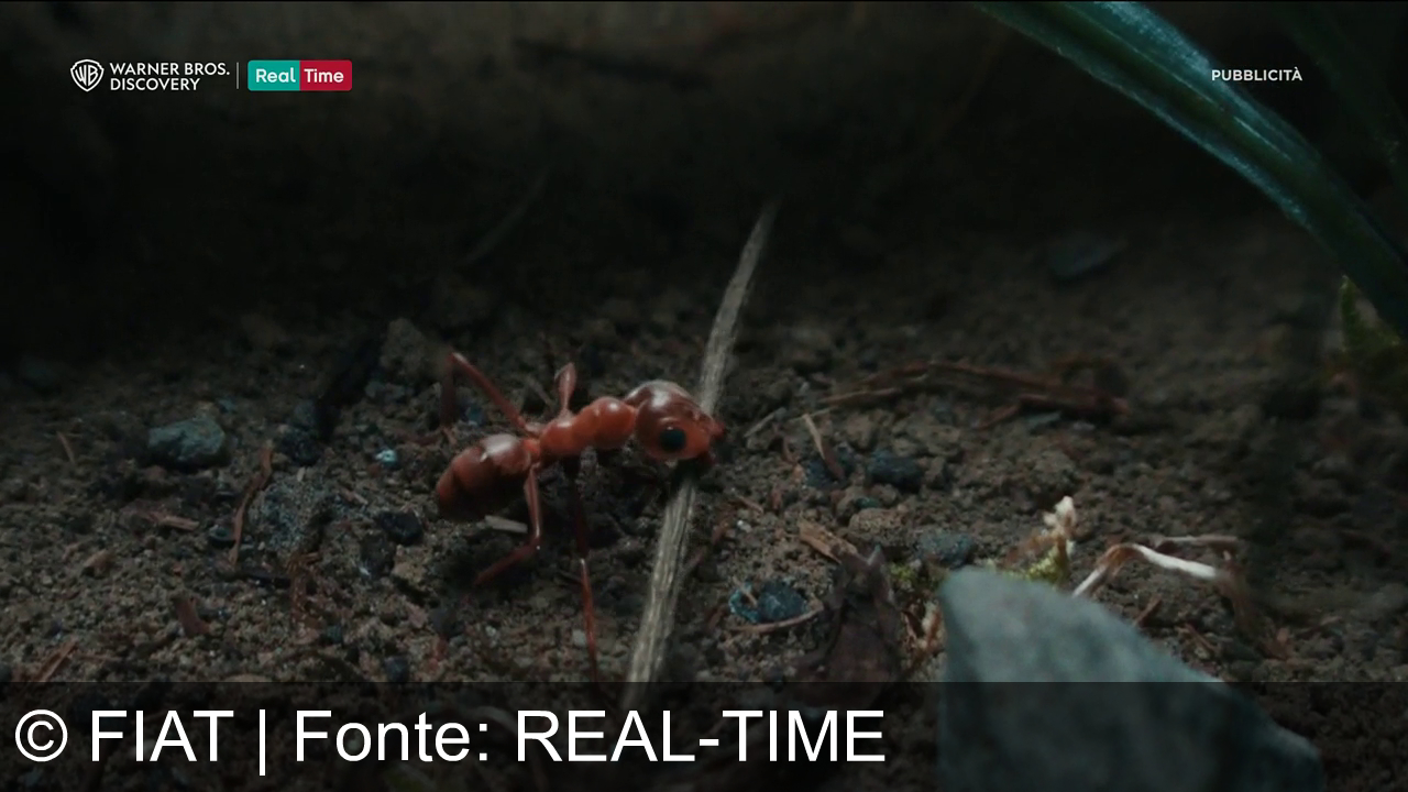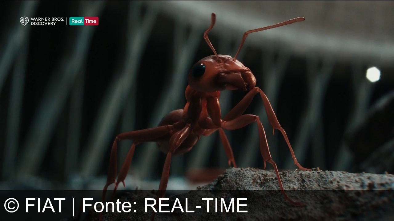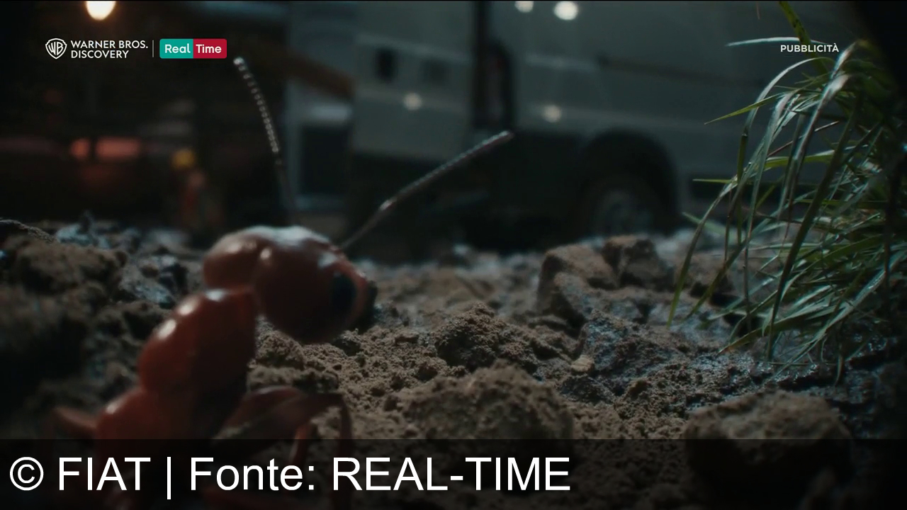 Una formica gigante è su un terreno sabbioso con delle piccole piante. Dietro c'è un furgone bianco e luce soffusa nell'ambiente circostante. In alto a sinistra, ci sono i loghi "Warner Bros. Discovery" e "Real Time", mentre in alto a destra c'è la scritta "PUBBLICITÀ".
