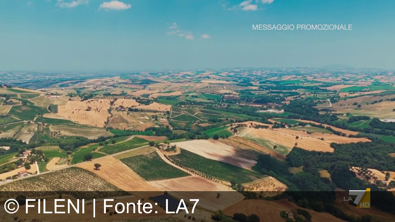 Campi verdi e dorati si alternano in un paesaggio collinare. Una fabbrica o un complesso industriale si trova al centro tra i campi. Il cielo è limpido. In alto a destra c'è la scritta "MESSAGGIO PROMOZIONALE". In basso a destra c'è il logo "LA 7 HD".