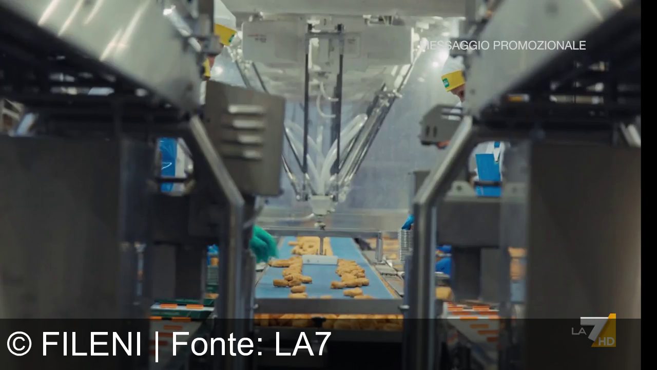 Linea di produzione alimentare con biscotti su un nastro trasportatore blu. Operai con guanti verdi e gialli lavorano sui lati della macchina. Ambiente industriale con attrezzature tecnologiche. Nell'angolo in alto a destra, testo "MESSAGGIO PROMOZIONALE". In basso a destra, logo "LA7 HD".