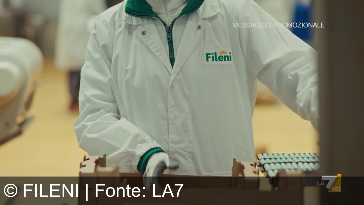 Inquadratura di una persona in camice bianco con logo "Fileni". Indossa guanti e lavora con una scatola di cartone. Ambiente dai colori chiari e sfondo sfocato. Scritte in alto a destra e logo "La7 HD" in basso a destra.