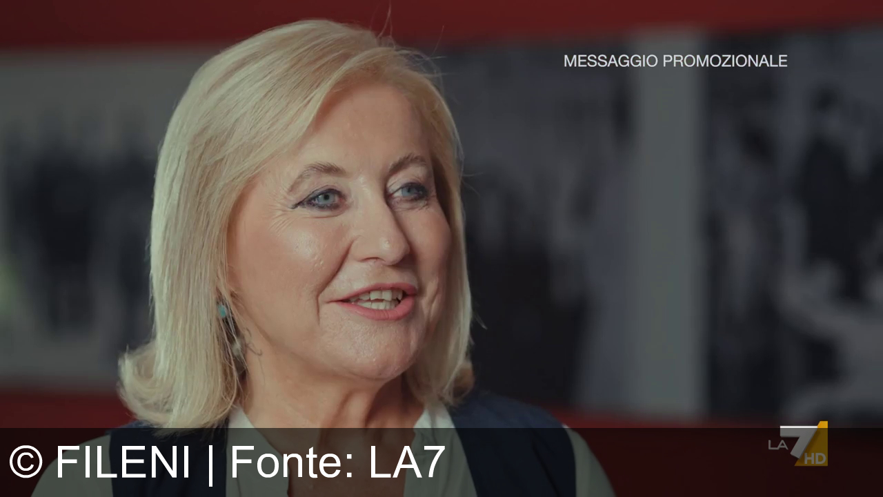 Una donna bionda con una camicia bianca e gilet blu si trova in una stanza con pareti rosse. Sullo sfondo ci sono alcune foto in bianco e nero appese al muro. In alto a destra c'è la scritta "MESSAGGIO PROMOZIONALE". Nell'angolo in basso a destra appaiono il logo di La7 e la scritta HD.