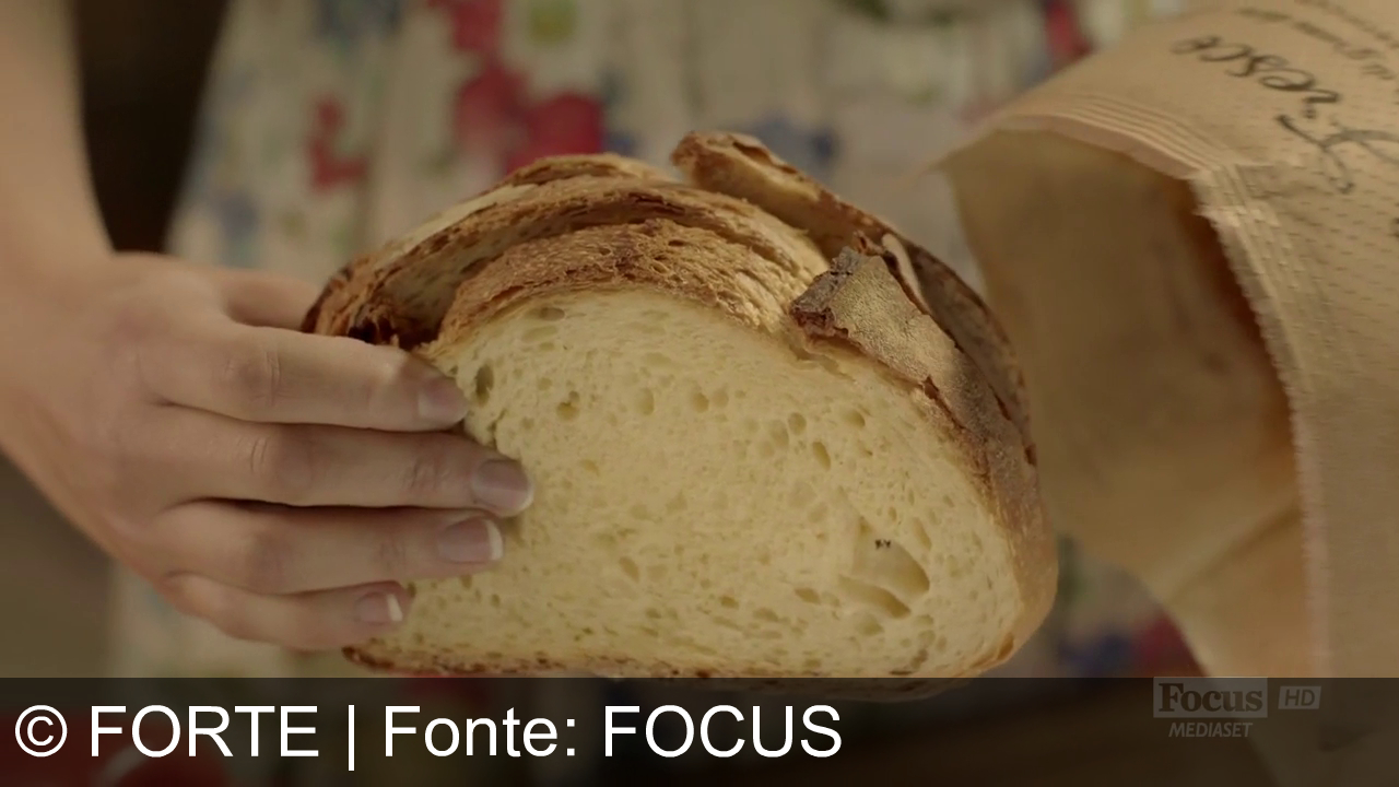 Una mano tiene una fetta di pane con crosta croccante e interno morbido. Sullo sfondo si vede un foglio di carta marrone e un tessuto con motivi colorati. Nell'angolo in basso a destra c'è un logo di Focus Mediaset.