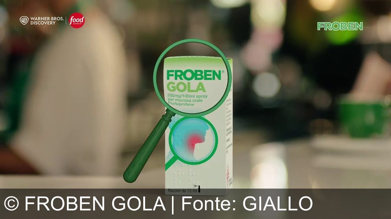 Scatola con scritto "Froben Gola" al centro, spray mucosa orale, flacone 15 ml. Una lente d'ingrandimento verde mostra immagine stilizzata di una gola infiammata. Sfondo sfocato, loghi "Warner Bros. Discovery" e "food network" in alto a sinistra, scritta "Froben" in alto a destra.