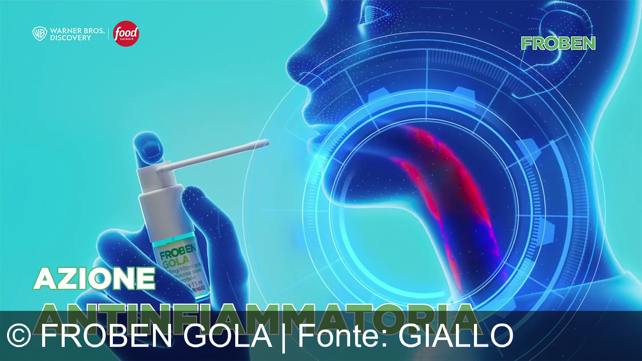 Profilo di un viso stilizzato in blu con un'illustrazione della gola evidenziata in rosso. Una mano tiene uno spray di Froben Gola. Testo "AZIONE ANTINFIAMMATORIA" in basso a sinistra. Loghi di Warner Bros. Discovery e Food Network in alto a sinistra.