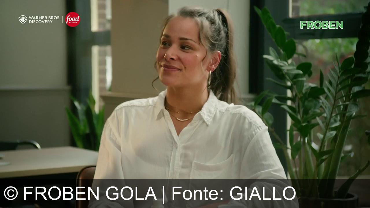 Una donna con una camicia bianca e i capelli legati sorride mentre è seduta, circondata da piante e vicino a una finestra. C'è una bottiglia con erogatore sul tavolo. In alto a sinistra i loghi di Warner Bros. Discovery e Food Network. In alto a destra la scritta "FROBEN".