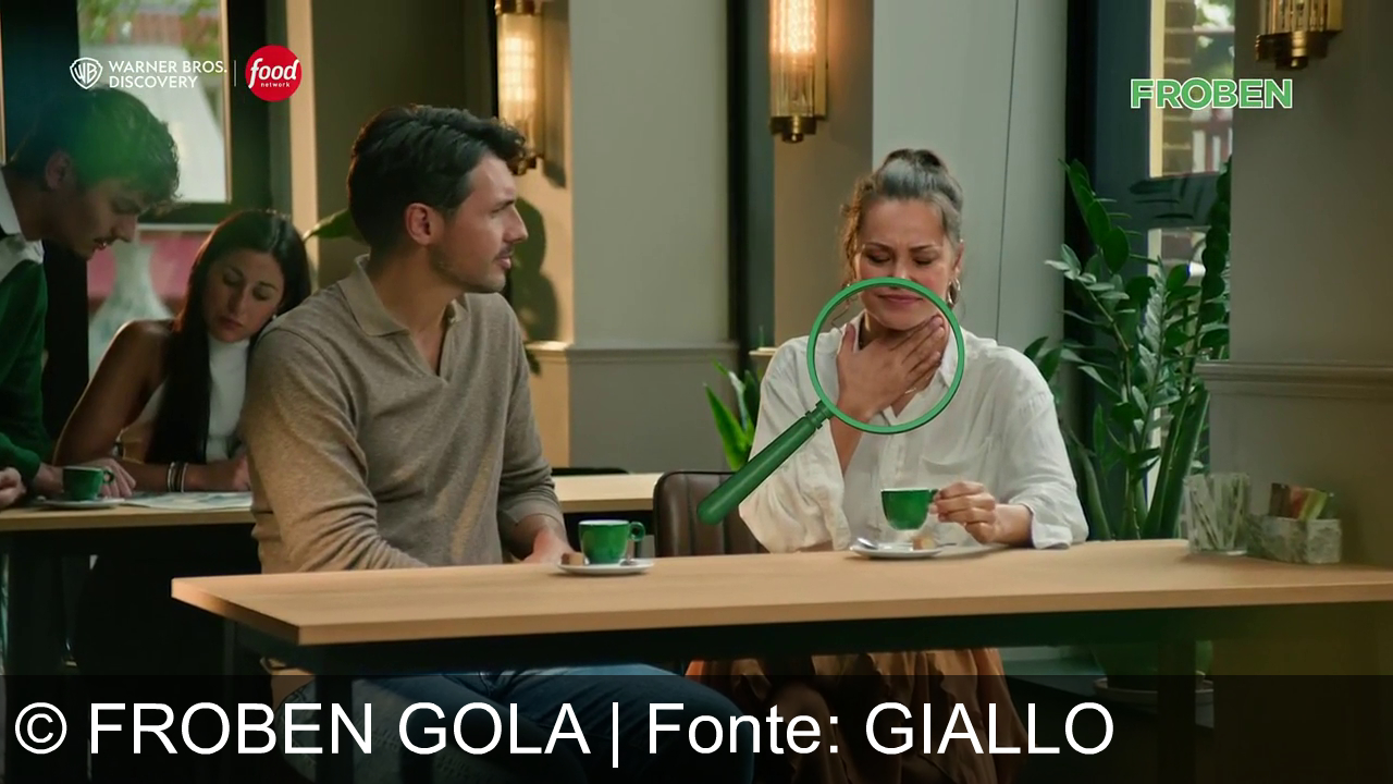 In un locale, una donna con una tazza in mano si tocca la gola con un'espressione di disagio. Accanto a lei, un uomo le parla. Sullo sfondo, altre persone sedute ai tavoli. Logo "Froben" in alto a destra e loghi "Warner Bros. Discovery" e "Food Network" in alto a sinistra.