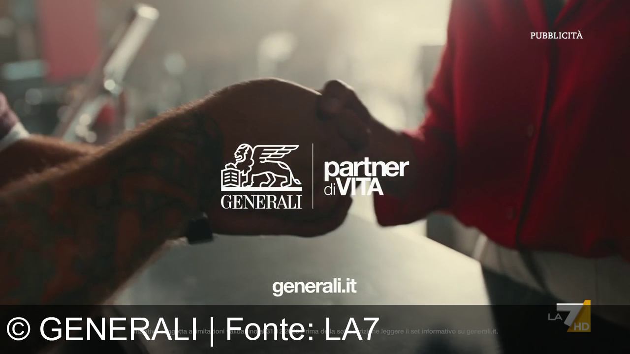Due mani strette in una stretta di mano. Una persona indossa una maglia rossa e l'altra ha un tatuaggio sull'avambraccio. Logo "Generali" con un leone e la scritta "partner di vita". Sotto, il sito generali.it. In alto a destra c'è scritto "PUBBLICITÀ" e in basso "La7 HD". Testo bianco su sfondo sfocato.