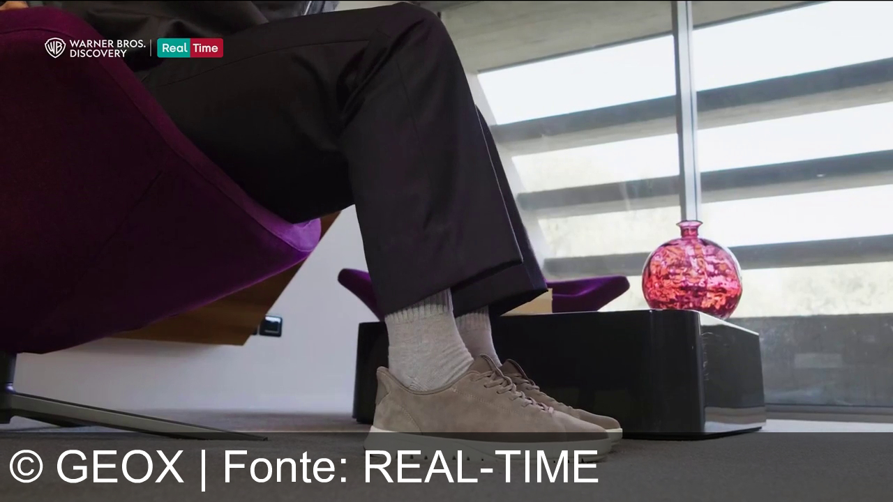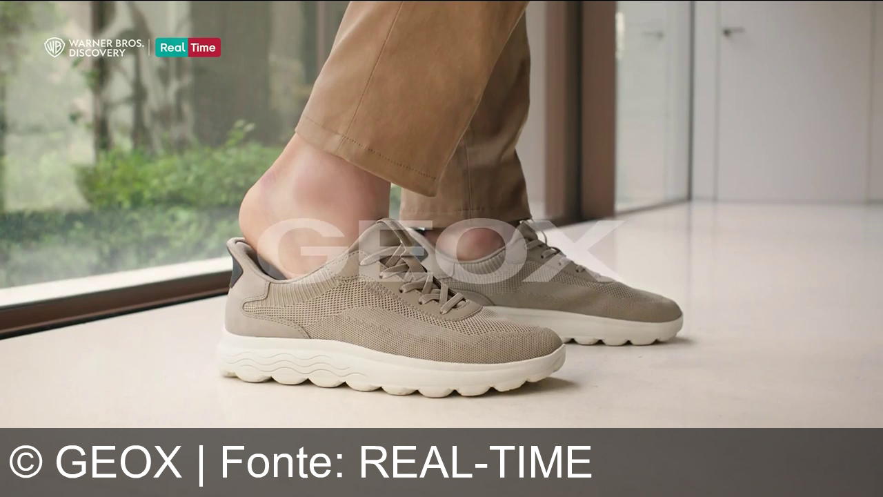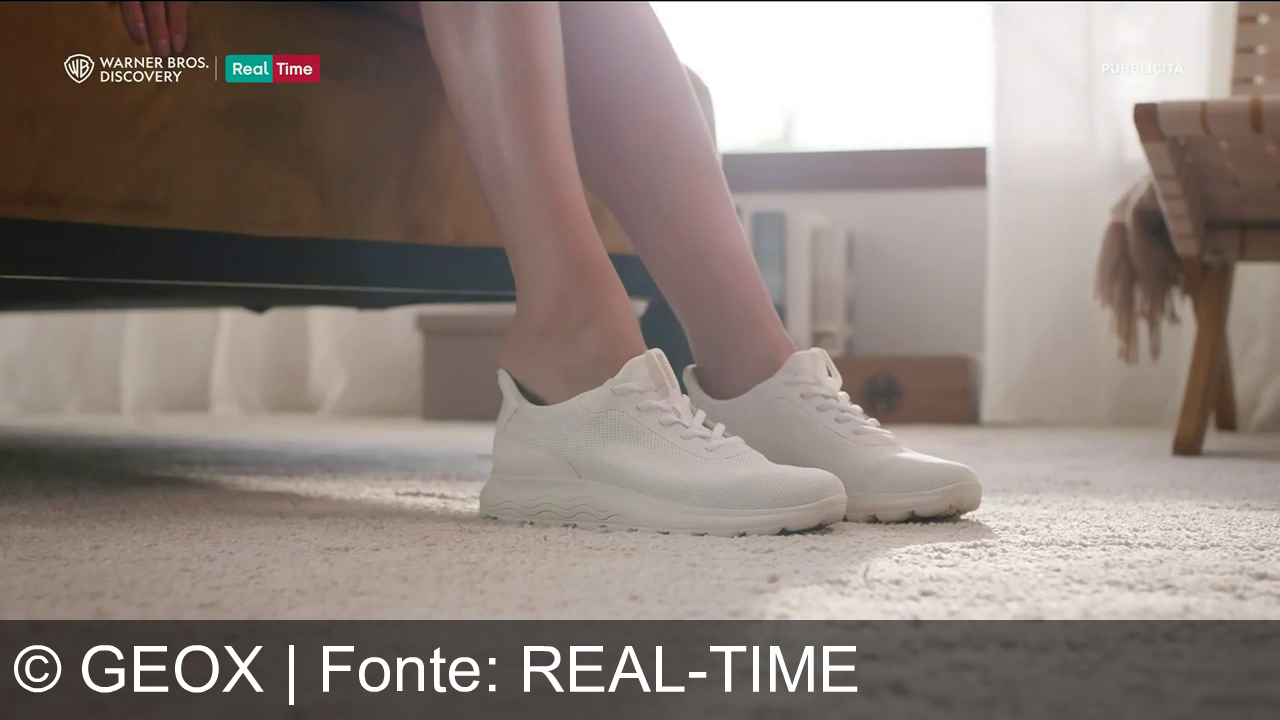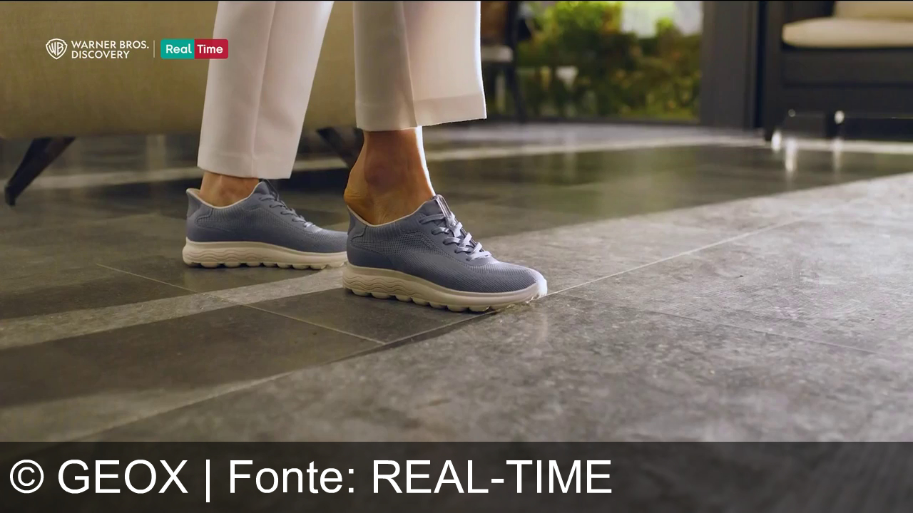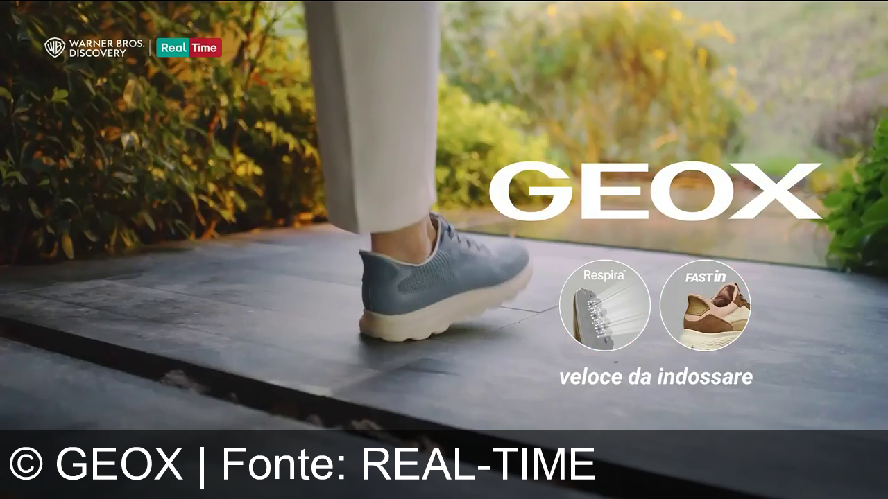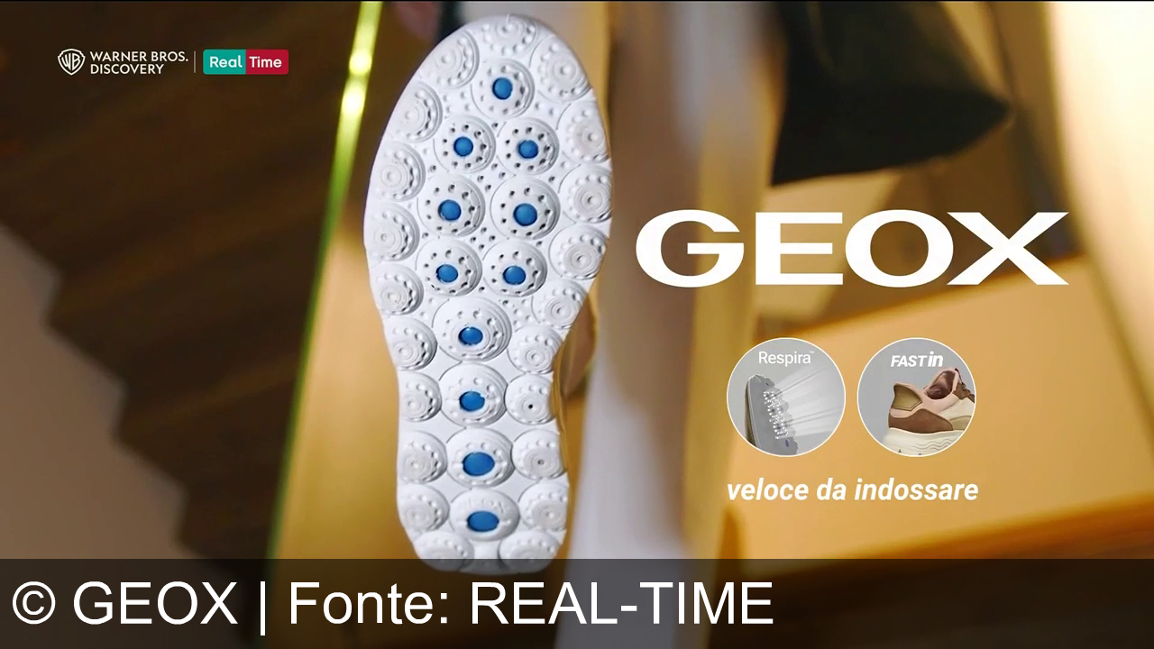 Una persona cammina su una passerella di legno, indossando scarpe blu Geox con suola bianca. A sinistra c'è il logo di Warner Bros. Discovery sopra un logo Real Time. Sul lato destro c'è il nome Geox in grande, con due cerchi che mostrano dettagli delle scarpe, accompagnati da testi "Respira" e "FAST in". In basso, la scritta "veloce da indossare" è visibile.