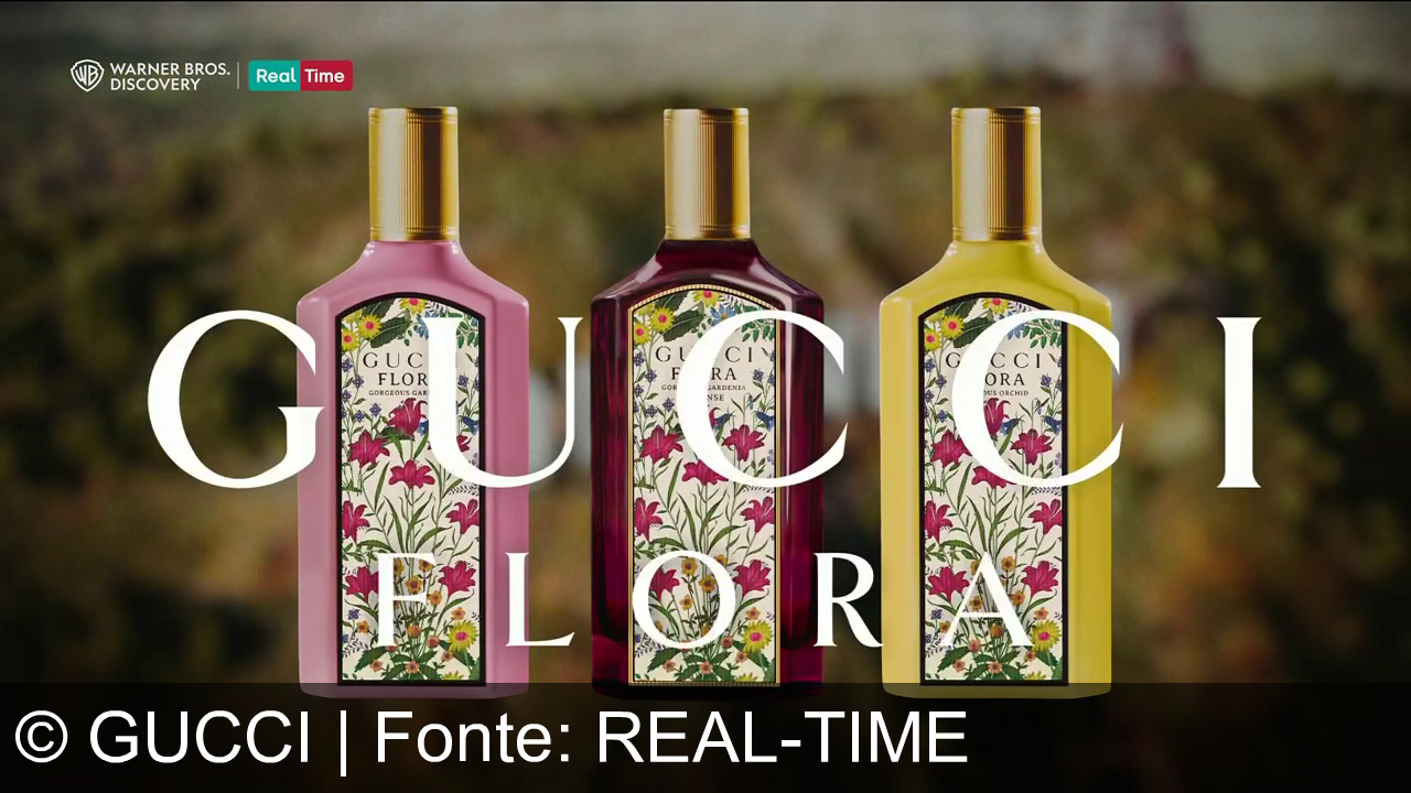 Quattro flaconi colorati con etichette floreali, scritta "GUCCI FLORA" in grande. Logo Warner Bros. Discovery e Real Time in alto a sinistra. Sfondo sfocato con colori caldi.