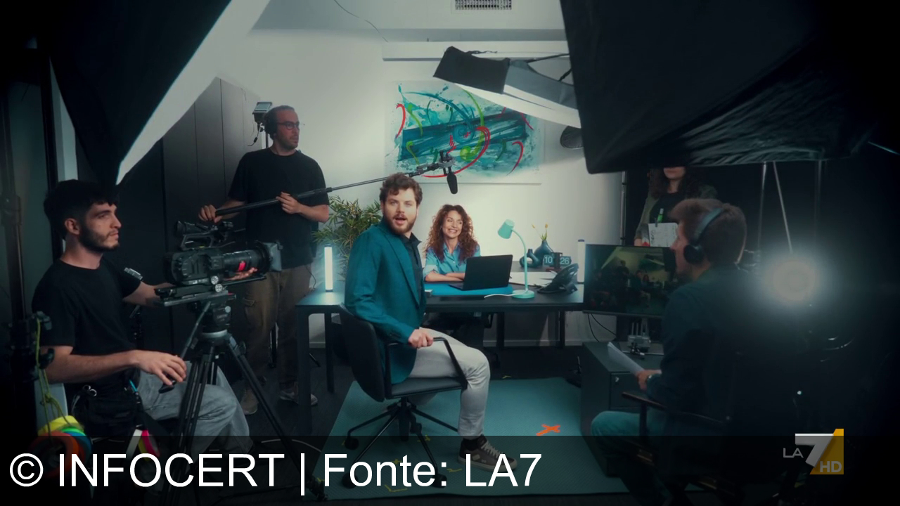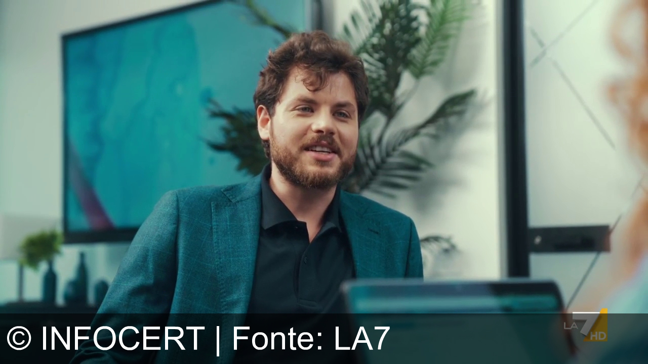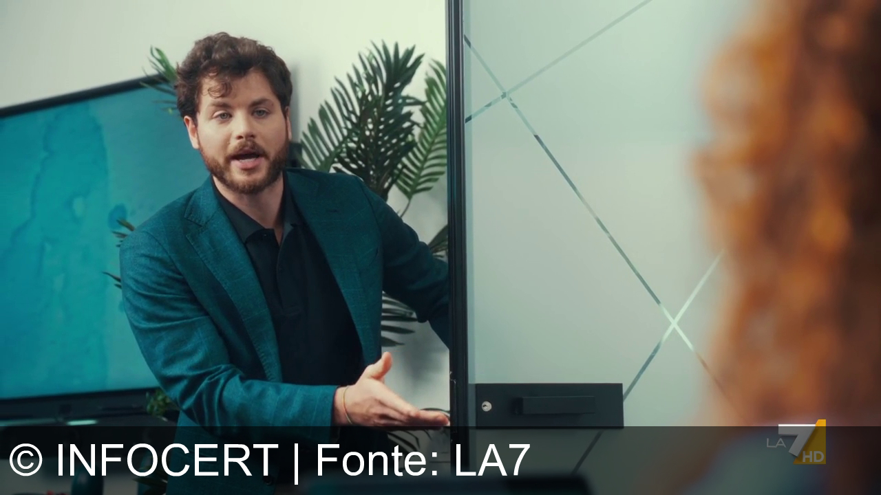 Un uomo con la barba e capelli ricci indossa una giacca blu e camicia nera. Sta indicando qualcosa con la mano all'interno di un ufficio. C'è una pianta e un quadro blu sullo sfondo. Una persona con capelli rossi è parzialmente visibile in primo piano. Logo "LA 7 HD" in basso a destra.